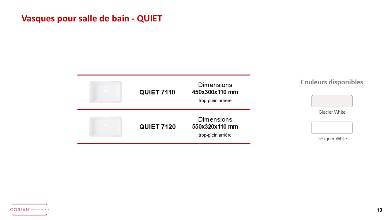 Le produit QUIET - vasques Corian® pour plan vasque du fabricant Corian® Solid Surface classé dans la catégorie Menuiserie intérieure > Matériaux - panneaux - plaques - câbles > Matériaux de synthèse pour agencement est référencé dans la Matériauthèque digitale Materiaux.archi.