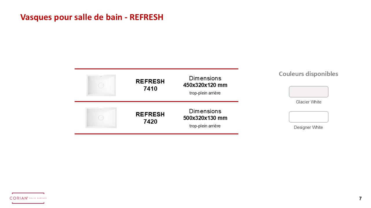Le produit REFRESH - vasques Corian® pour plan vasque du fabricant Corian® Solid Surface classé dans la catégorie Menuiserie intérieure > Matériaux - panneaux - plaques - câbles > Matériaux de synthèse pour agencement est référencé dans la Matériauthèque digitale Materiaux.archi.