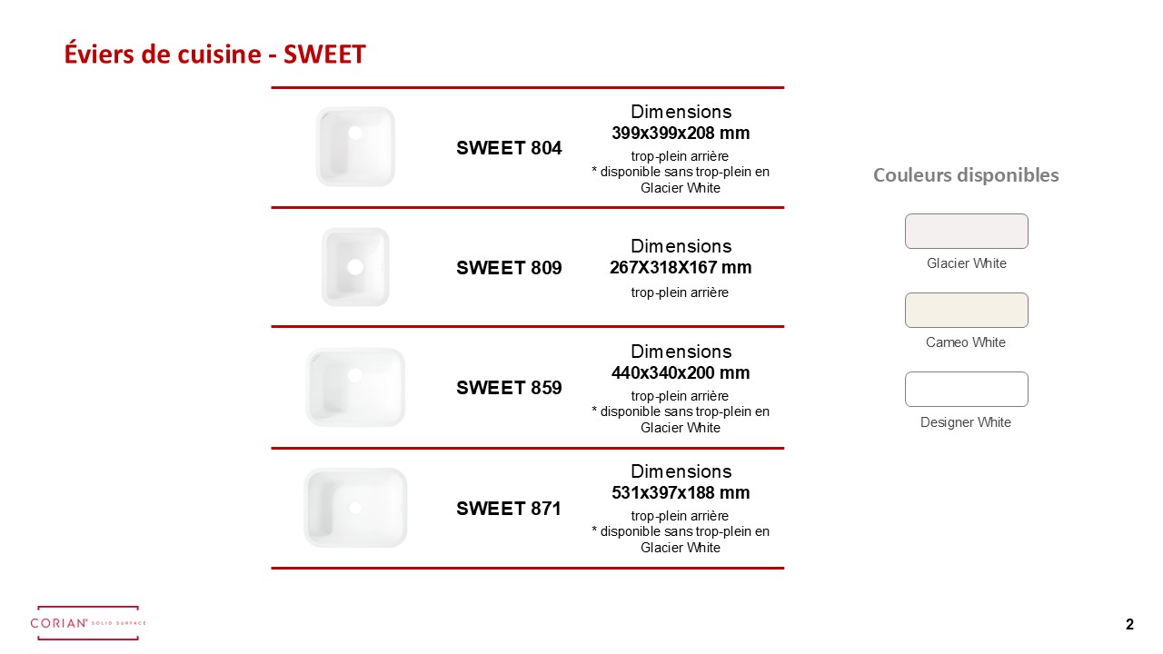Le produit SWEET - éviers de cuisine Corian® du fabricant Corian® Solid Surface classé dans la catégorie Menuiserie intérieure > Matériaux - panneaux - plaques - câbles > Matériaux de synthèse pour agencement est référencé dans la Matériauthèque digitale Materiaux.archi.