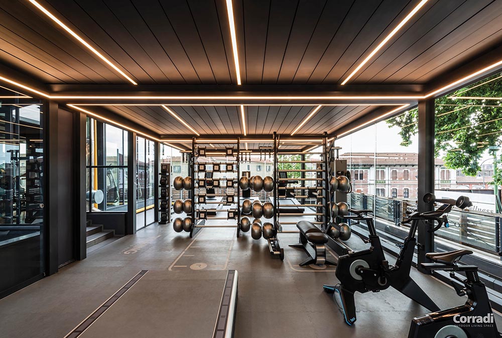 La gouttière donne le cuirla possibilité d’intégrer des lumières à LED sur l’ensemble du périmètre intérieur et de créer un système d’éclairage modulaire, efficace et particulièrement agréable. La géométrie particulière des poutres et des piliers fait que le cuir extérieur d’Imago® peut être complètement différent de celui intérieur, pour un effet bicolore original et accueillant.