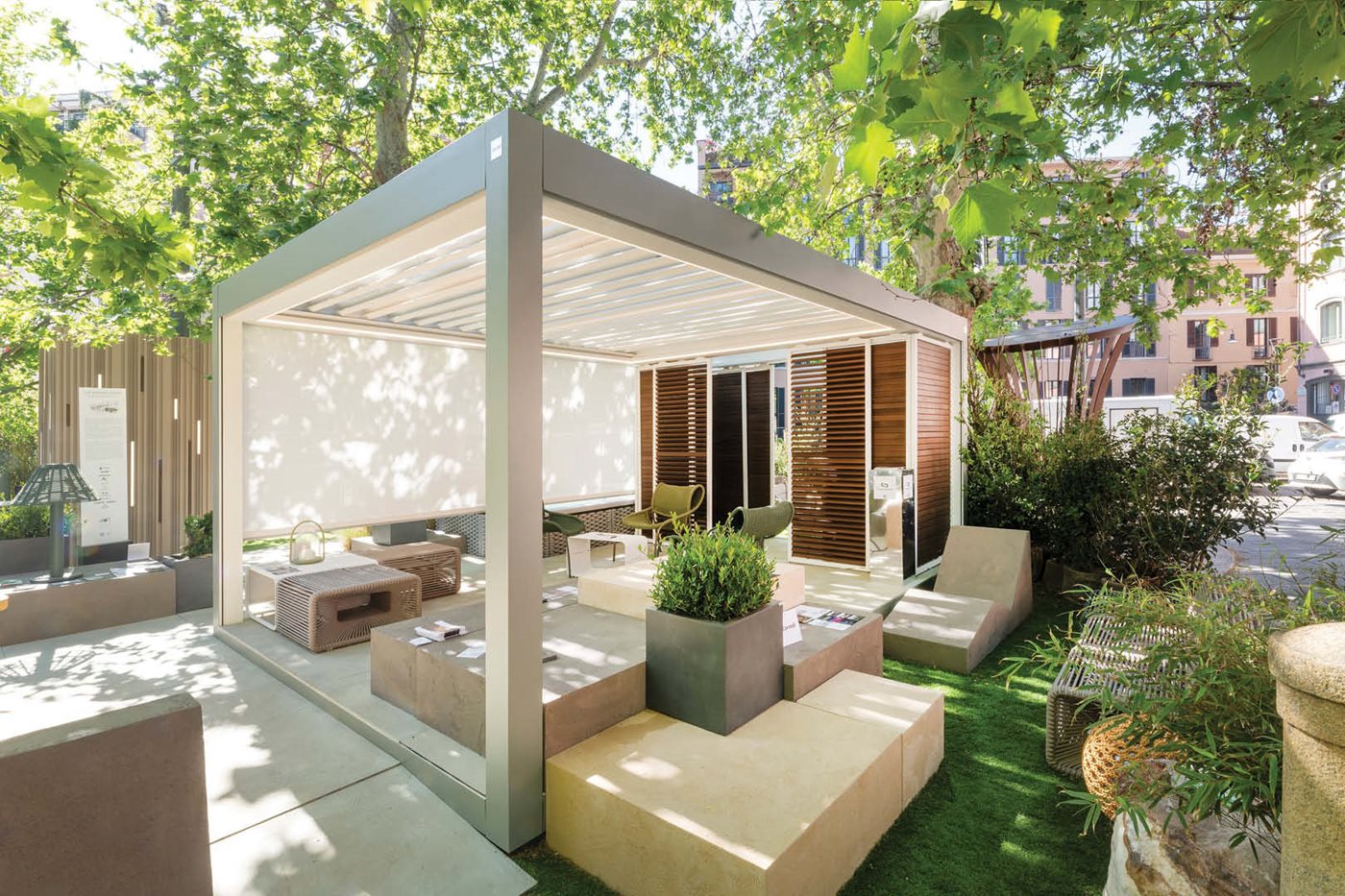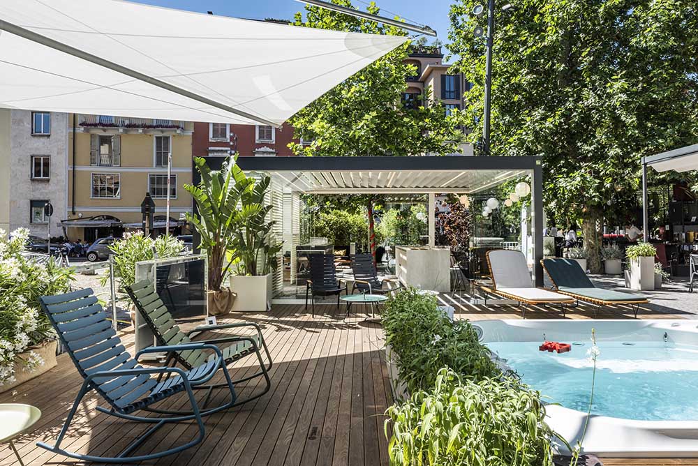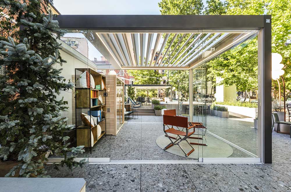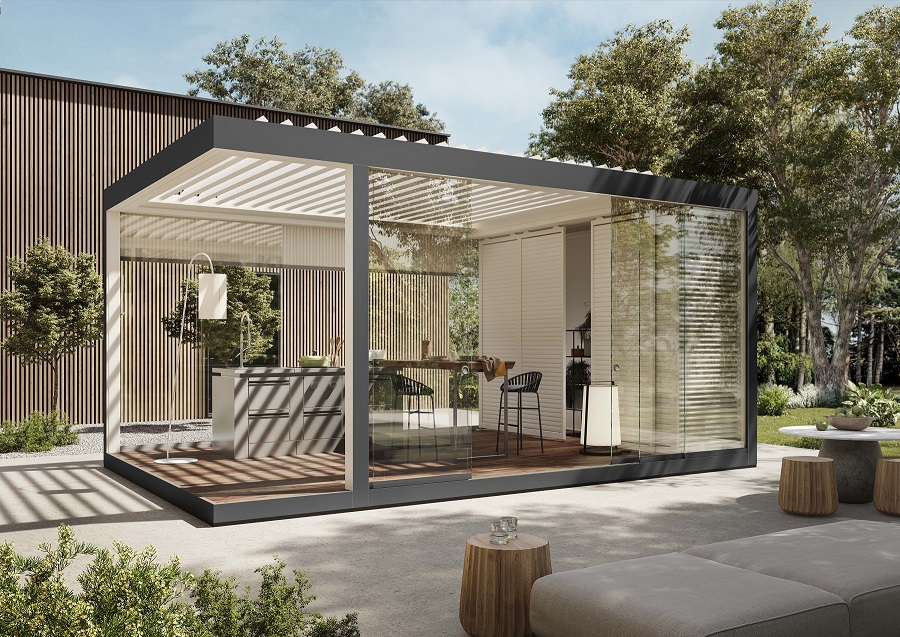 Imago® va au-delà du concept de produit outdoor pour entrer dans la dimension de l’espace. Une solution à lames orientables jusqu’à 135° autosuffisante pour les détails de construction : plate-forme, piliers, poutres en pleine continuité architecturale. Le design épuré est poussé à l’extrême.
