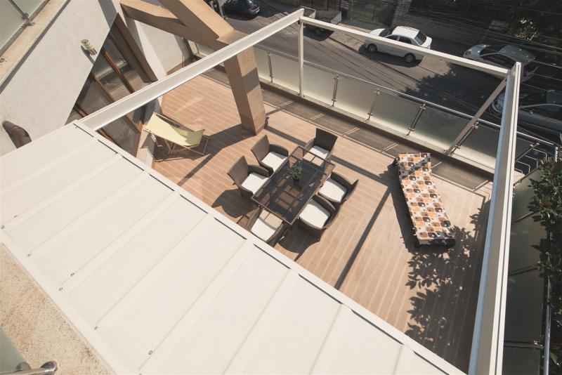 Enfin, la large gamme de couleurs disponibles vous permet de mettre en valeur la personnalité marquée de cette Pergotenda® : anthracite, ivoire, blanc plus, pour un effet éclatant et précieux. Pour des atmosphères plus intrigantes, par contre, vous pouvez choisir entre les tout nouveaux noir nuit et Dark Bronze, ou opter pour le RAL ad hoc à combiner avec des plates-formes modulaires en céramique ou en bois Ipè, au look chaleureux dans ses teintes allant du marron au vert olive.