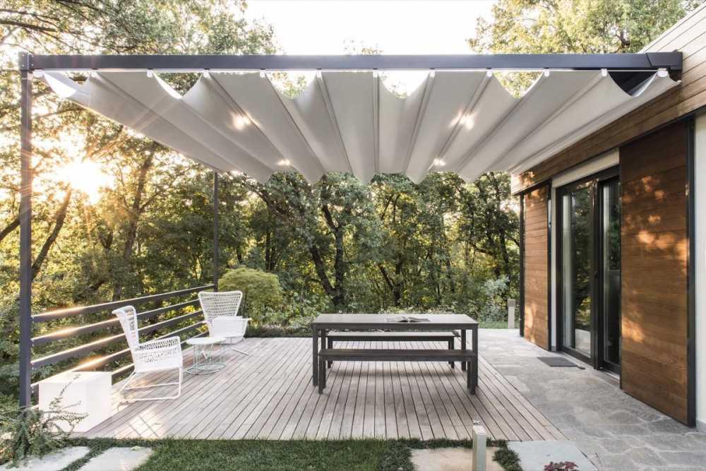Ce modèle de Pergotenda Corradi offre également un large éventail d'options de personnalisation. Des mesures, qui permettent d'atteindre un maximum de 1050 x 600 cm par module, à la configuration de la toile, qui peut être tendue avec des entretoises ou trapézoïdale, avec un écoulement des eaux de pluie continu ou alterné, unilatéral ou des deux côtés. Enfin, vous pouvez choisir d'insérer le mécanisme de déplacement manuel, dans les dimensions 350 x 600 cm et 700 x 600 cm, aussi bien dans la version autoporteuse que dans la version adossée.