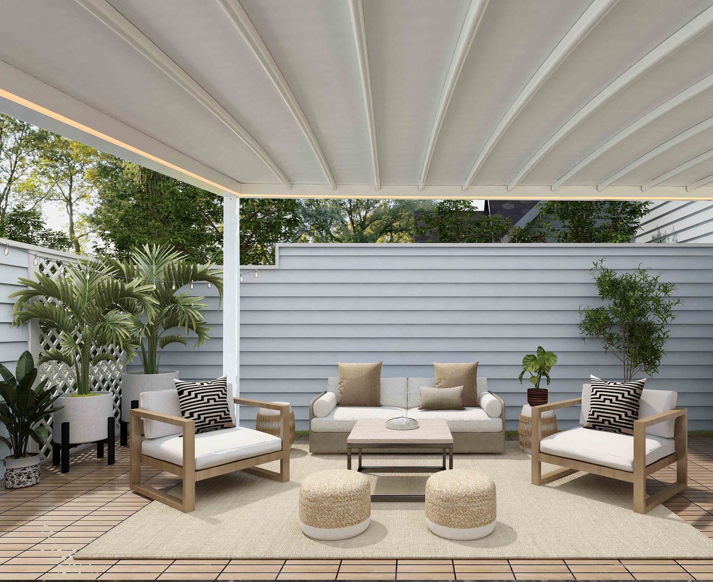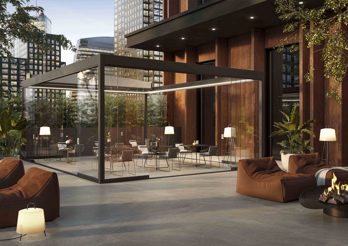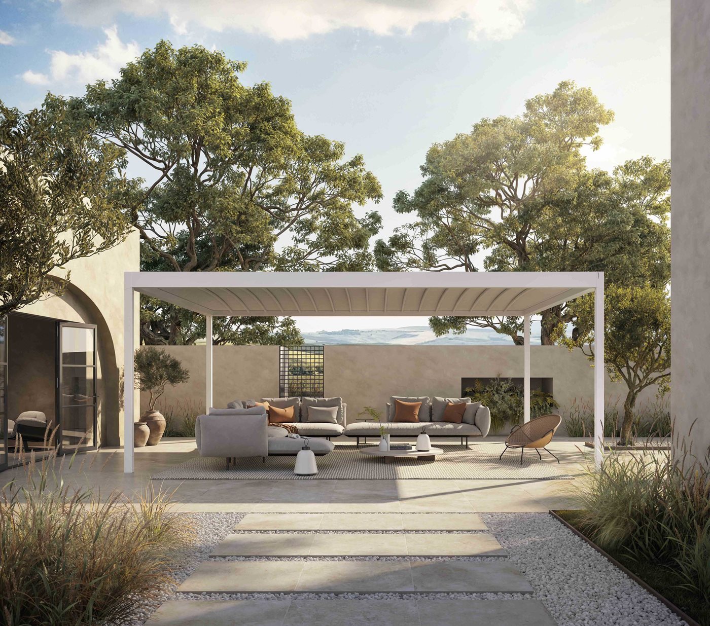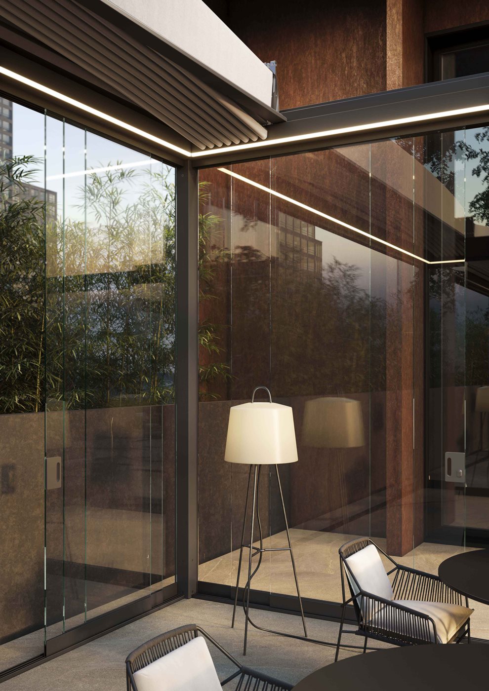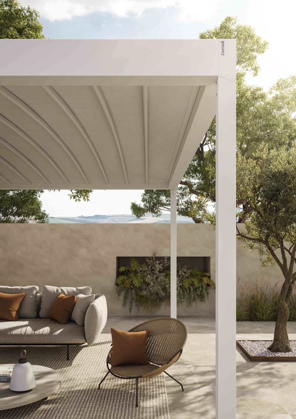 Les tubes qui soutiennent la toile de la pergola Alba Butterfly comportent un calandrage à rayon continu, ce qui rend le système plus robuste et favorise l'écoulement de l'eau de pluie. La gouttière périmétrique d'Alba Butterfly a été conçue en incorporant quelques innovations intéressantes. Les dimensions, 12,2 x 8,7 cm, permettent un débit presque deux fois supérieur à celui de la version à lames orientables. En outre, la section est dotée d'une double chambre qui permet la fixation des fermetures périmétriques et des accessoires sans compromettre l'étanchéité à l'eau. La surface intérieure de la gouttière est légèrement bombée et inclinée pour guider l'écoulement de l'eau vers les convoyeurs et les piliers. La toile de la couverture est positionnée coplanairement à la gouttière périmétrique d'Alba Butterfly : de cette façon, il est possible d'éviter que des gouttes reviennent à l'intérieur de la structure même en cas de fortes tempêtes. Alba Butterfly peut être complétée par des fermetures de la gamme Corradi. MyGlass, Aura, Magiko B, Brio S peuvent être installées mais, comme pour la version d'Alba à lames, les glissières et les boîtiers ne sont pas intégrés dans les poutres et les piliers de la structure. La gouttière peut être équipée d'une lumière LED continue sur tout le pourtour intérieur (en option), fixée sur le profilé d'angle de la gouttière qui, en l'absence d'éclairage, est finie avec un profilé.