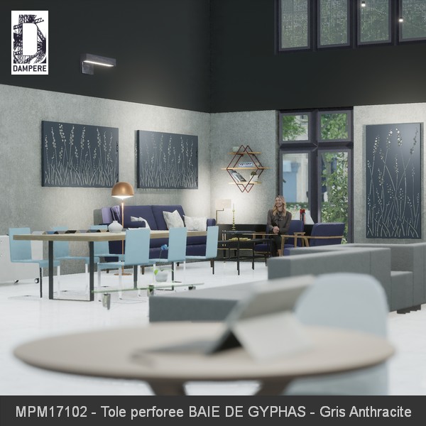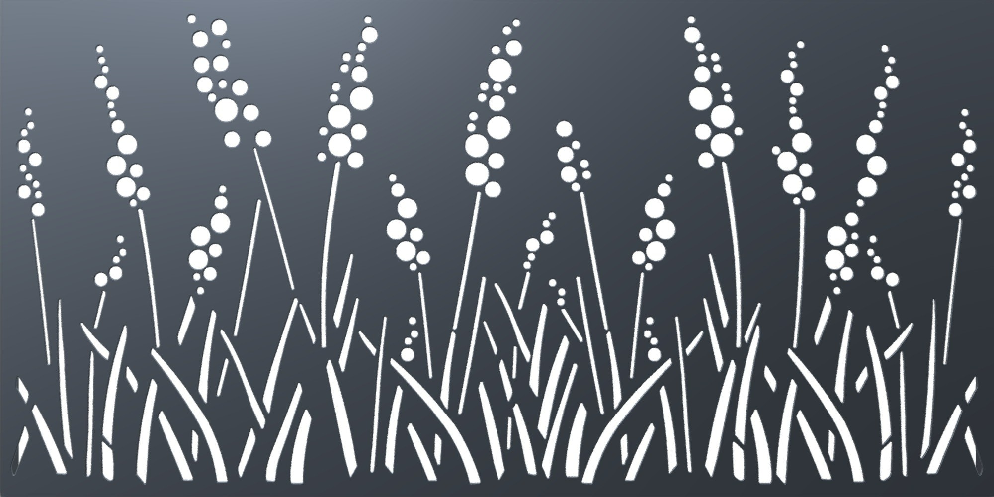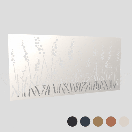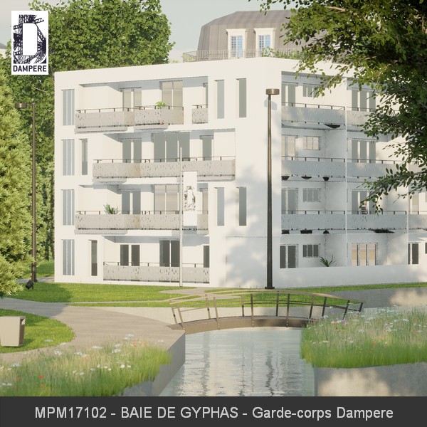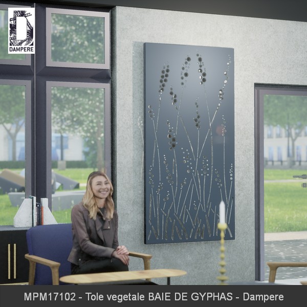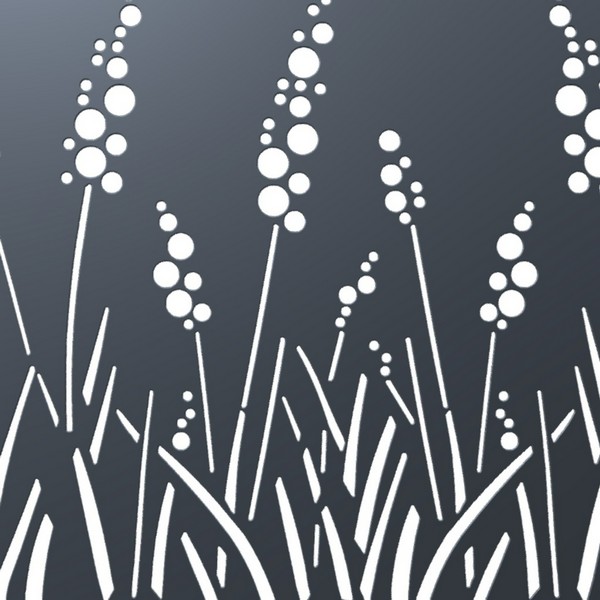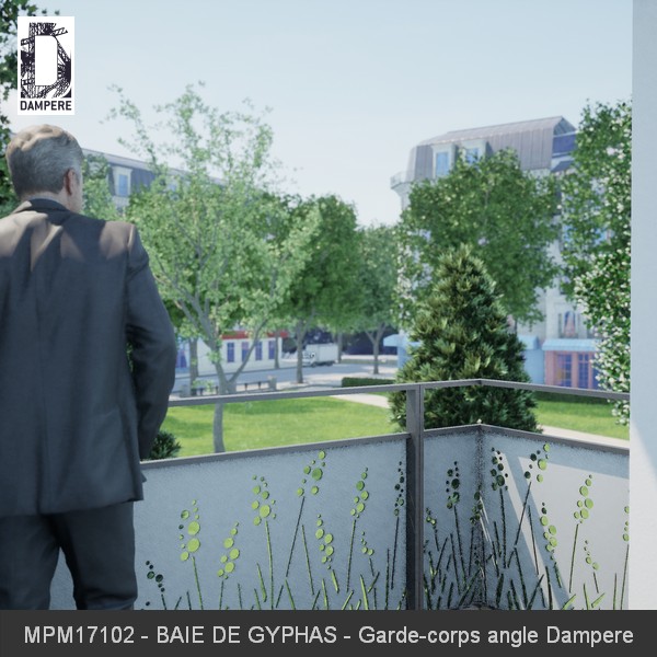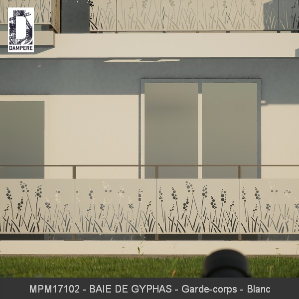 La tôle garde corps Baie de Gyphas DAMPERE reprend le dessin d'un feuillage végétal par la technique de découpe laser pour réaliser le motif d'un roseau accompagné de bulbes stylisés par des ronds clairsemés, en privilégiant l'opacité et l'effet brise vue du panneau, réussissant à maximiser l'effet occultant par sa transparence proche de 10% de vide.