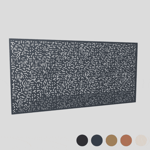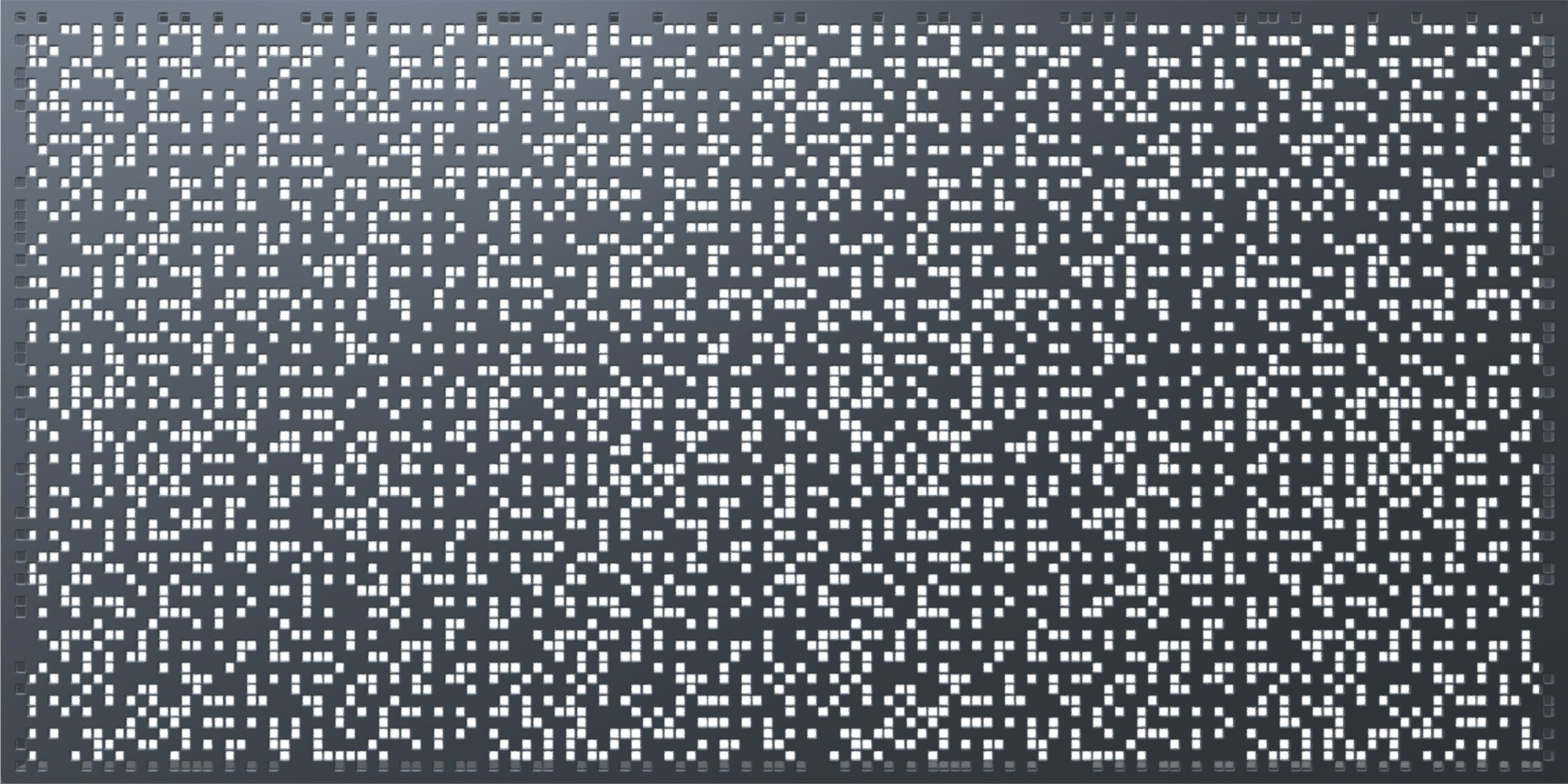 La tôle perforée décorative Codex DAMPERE est l'illustration d'une nuée de perforations carrées aléatoires donnant un effet diffus selon des permutations calculées par une séquence arithmétique.