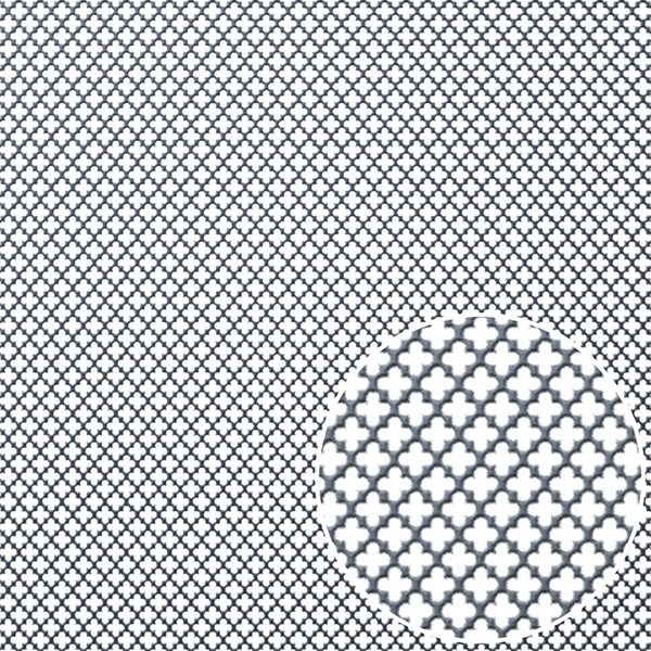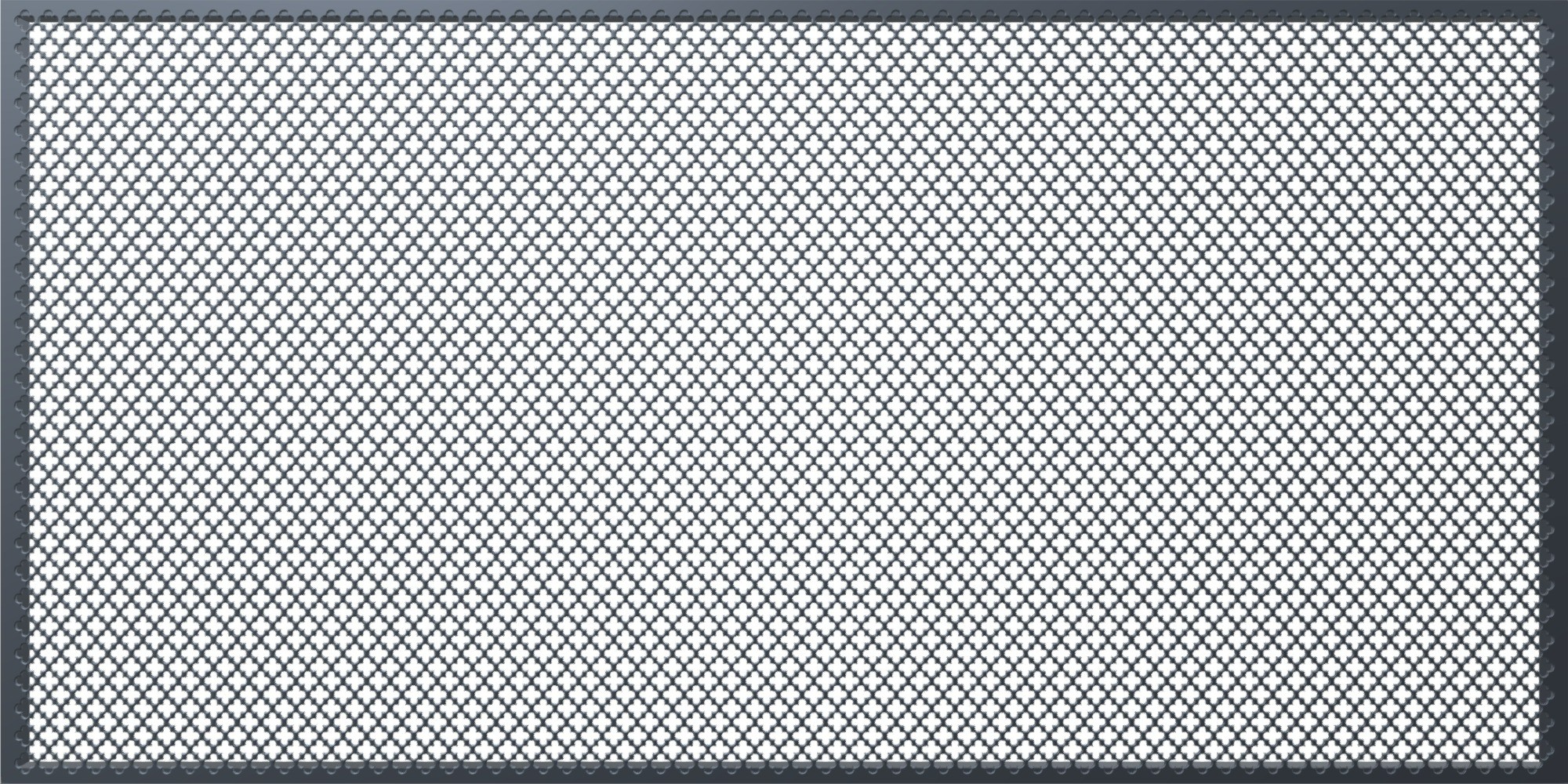 La tôle cache radiateur Hosanna est composée de trèfles à quatre feuilles spatulées, selon une disposition en trame diagonale resserrée pour améliorer l'imbrication des formes, resserrées pour augmenter le taux de transparence. Le panneau de remplissage offre une grille de ventilation performante proche de 50% de vide.