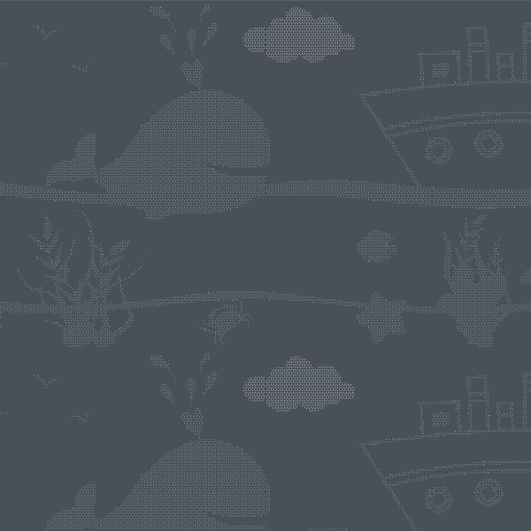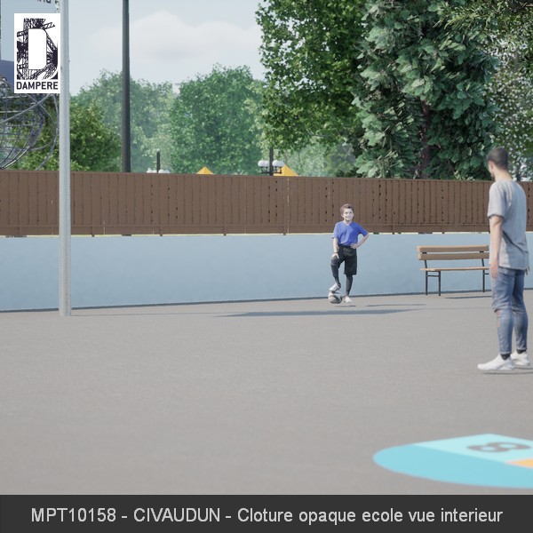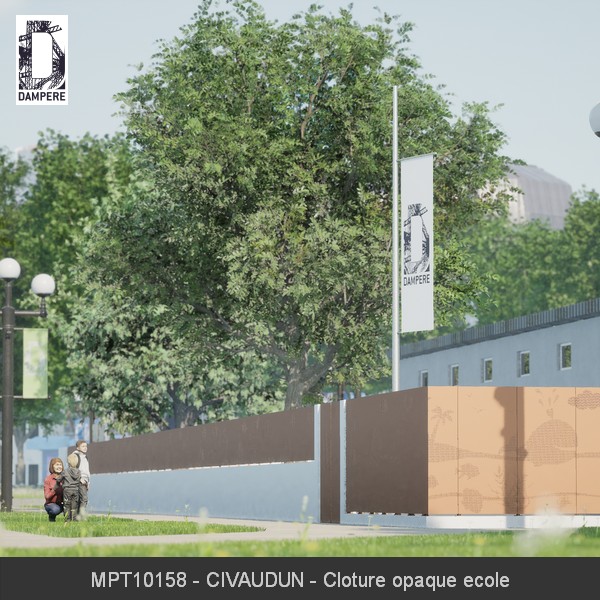 Le panneau occultant Civaudun DAMPERE est un dessin sur support métallique transparent qui présente le contour de fonds sous-marins, une baleine accompagnant un bateau, perçu à contre-jour par un enfant dans une cour d’école en regardant la clôture extérieure.