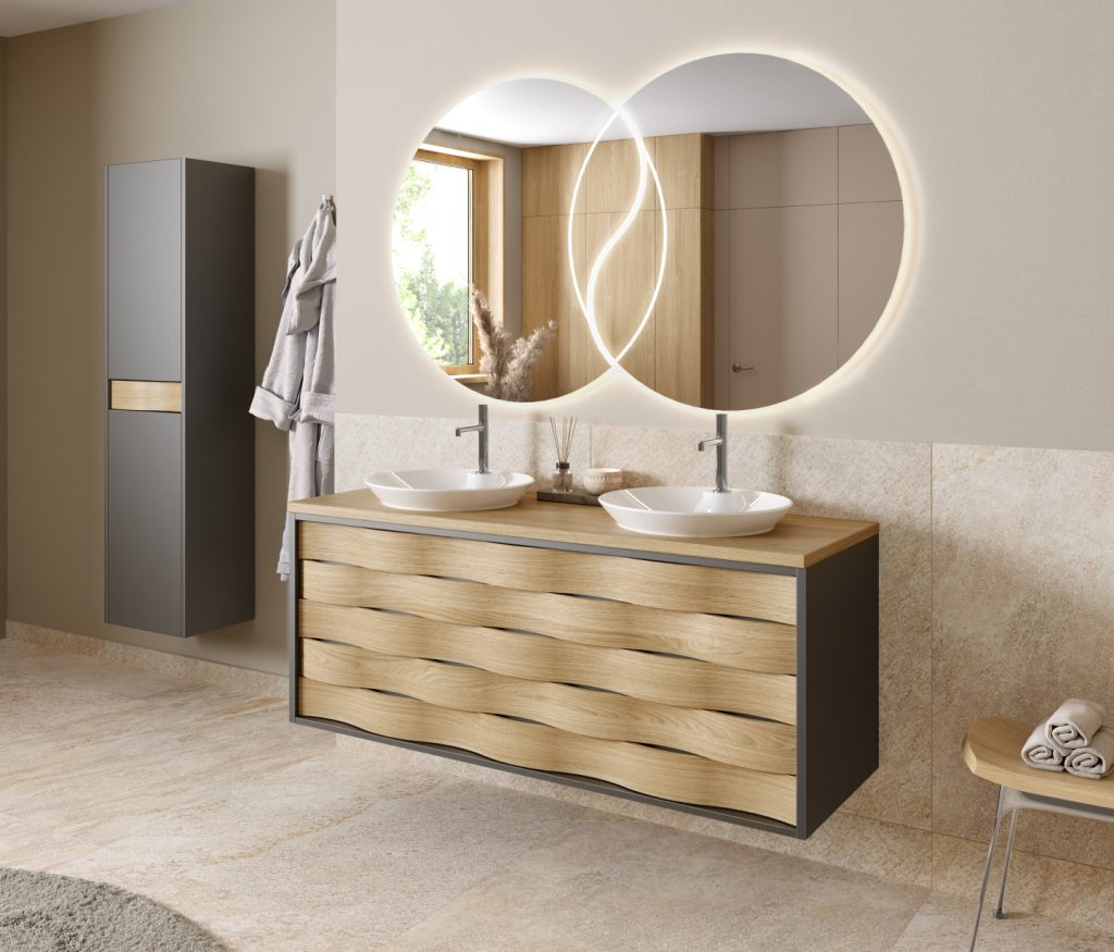 Idéal, l’ensemble peut être positionné avec un meuble L120 (Ø70) ou L150 (Ø90), avec ou sans halo d’ambiance périphérique.
