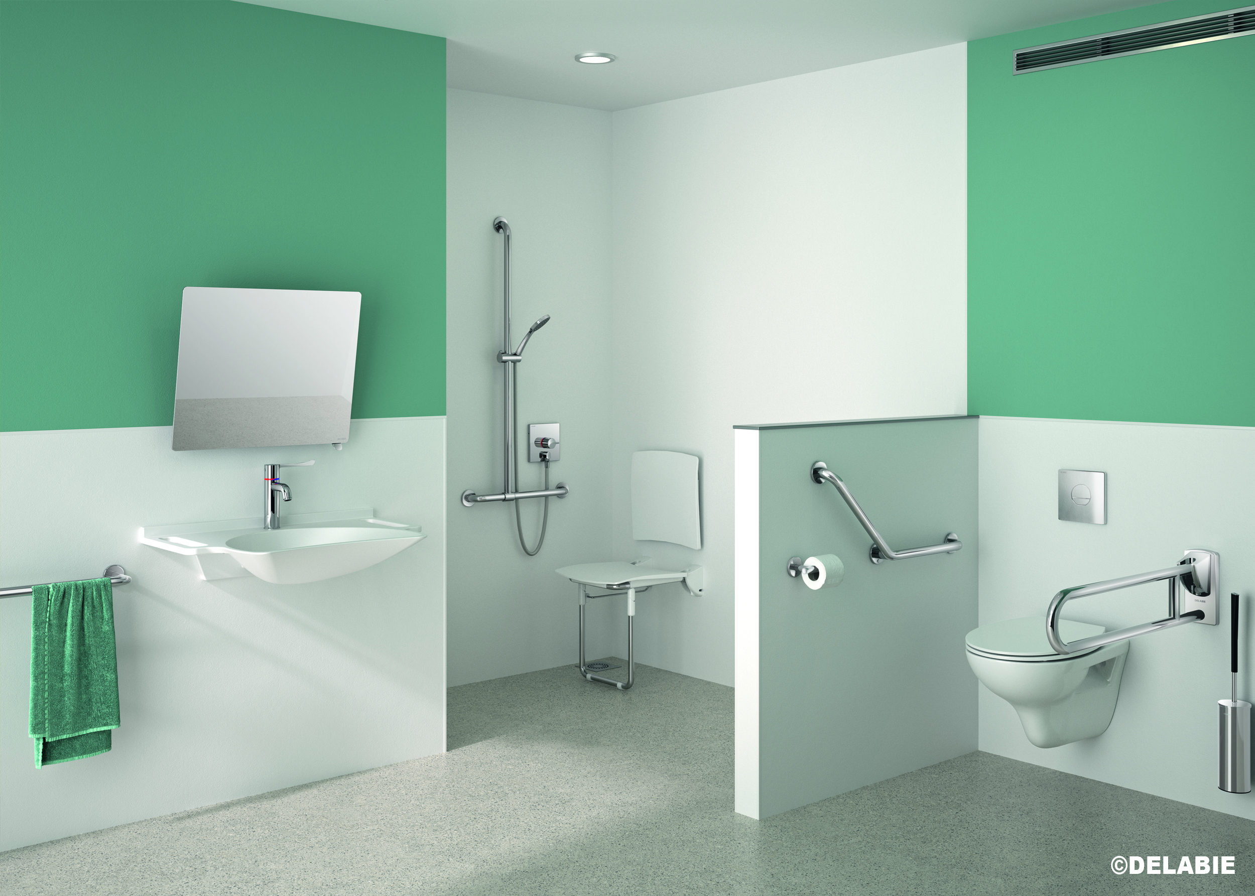 Le produit Barre de maintien en T et remontée verticale coulissante Inox brillant de DELABIE est prescrit dans des projets de type : Hôtellerie Restauration .