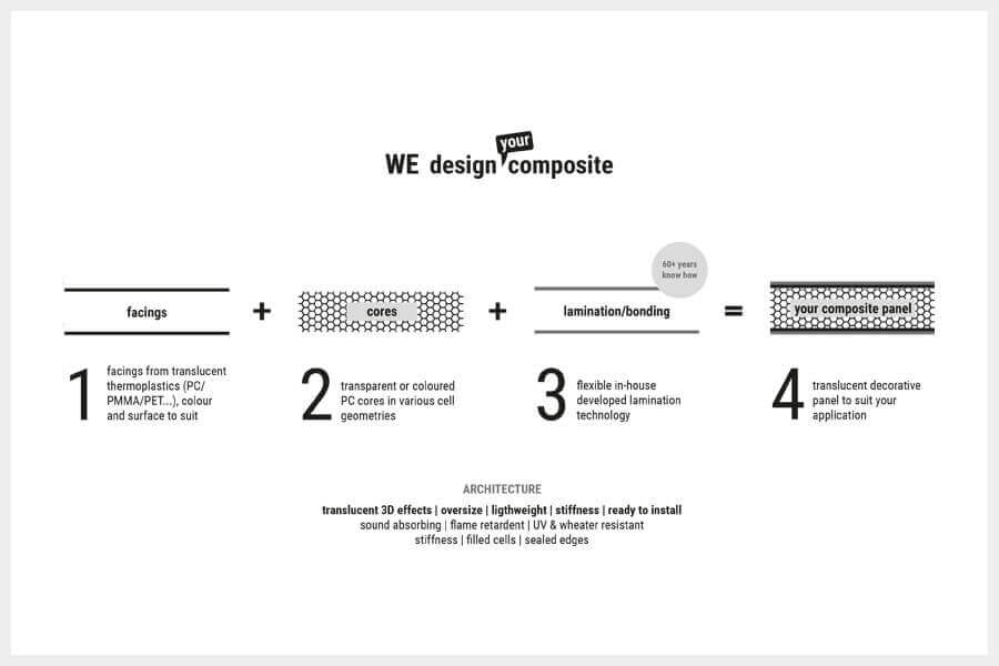 The architectural panels from design composite can be combined as desired and can be individually arranged according to individual requirements. Honeycomb structure, colours, shapes (2D), thicknesses and additional design features such as digital printing or the integration of elements, e.g. glass crystals can be implemented individually as desired.