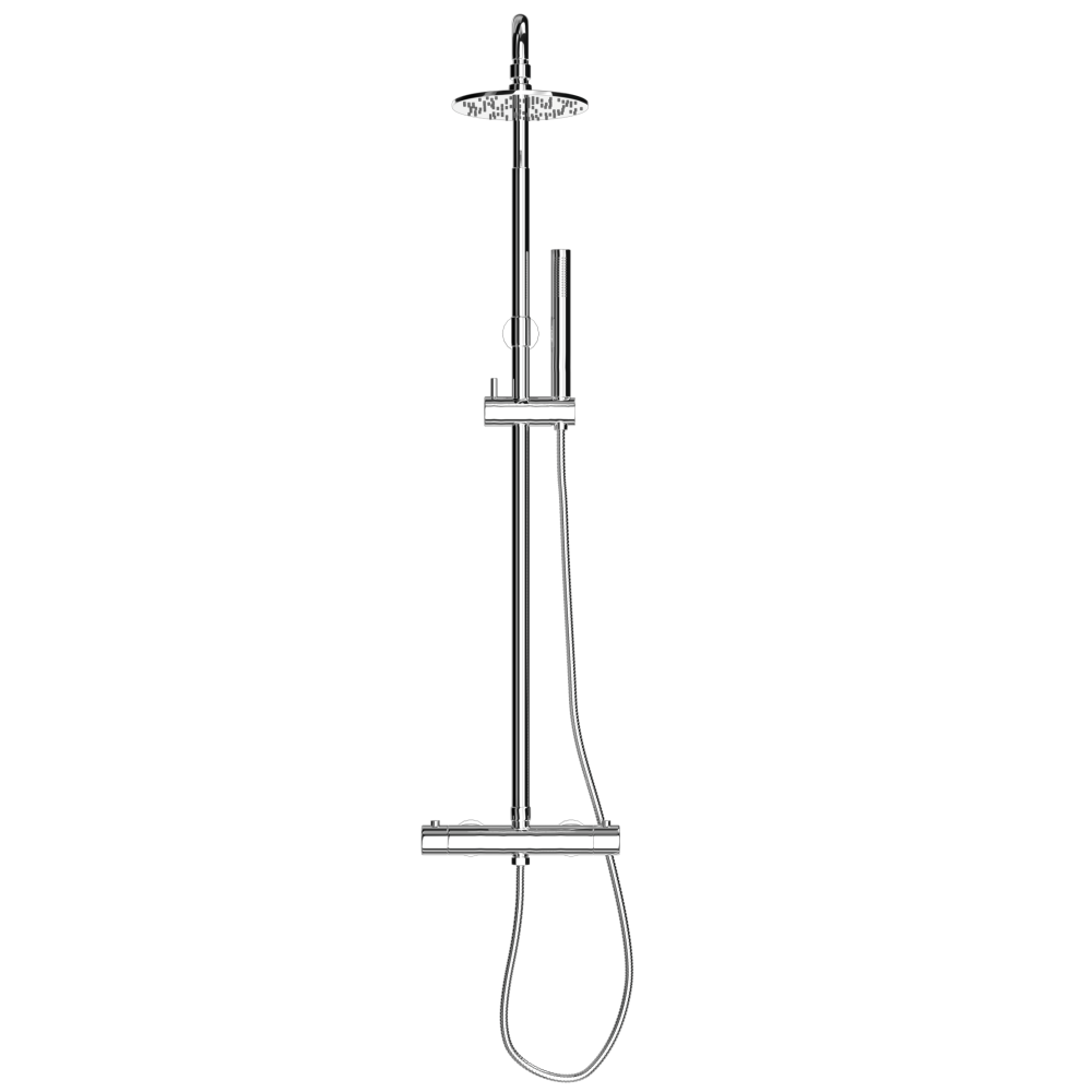 Colonne de douche avec mitigeur thermostatique double sortie. Cartouche thermostatique Vernet, avec filtres. Butée à 38°C, afin de garantir la sécurité des enfants. Pommeau de douche Ø25mm, support de douchette réglable, douche de tête Ø200mm. Avec clapets anti-retour et joints filtres fournis. Acier inoxydable AISI 304. Mitigeur thermostatique de douche double sortie.