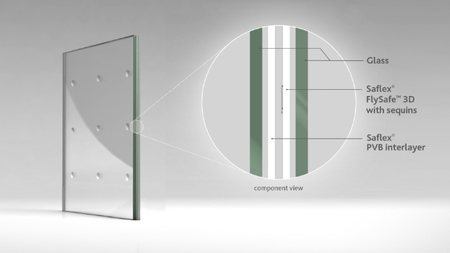 Ces intercalaires pour vitrages de protection des oiseaux offrent un vitrage efficace et respectueux des oiseaux, reconnu dans l'industrie et par les ornithologues comme le meilleur de sa catégorie avec un minimum d'obscurcissement des vues. Saflex FlySafe 3D offre des options plus efficaces pour les façades de bâtiments avec deux tailles de paillettes différentes, 6 mm (0,24 po) et 9 mm (0,35 po) de diamètre, avec deux options de couleur argent mat et brillant.