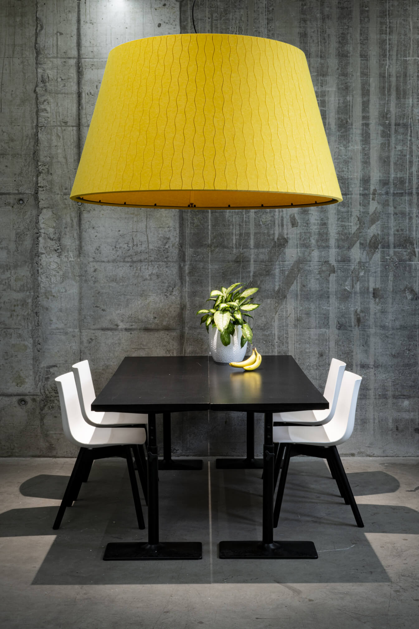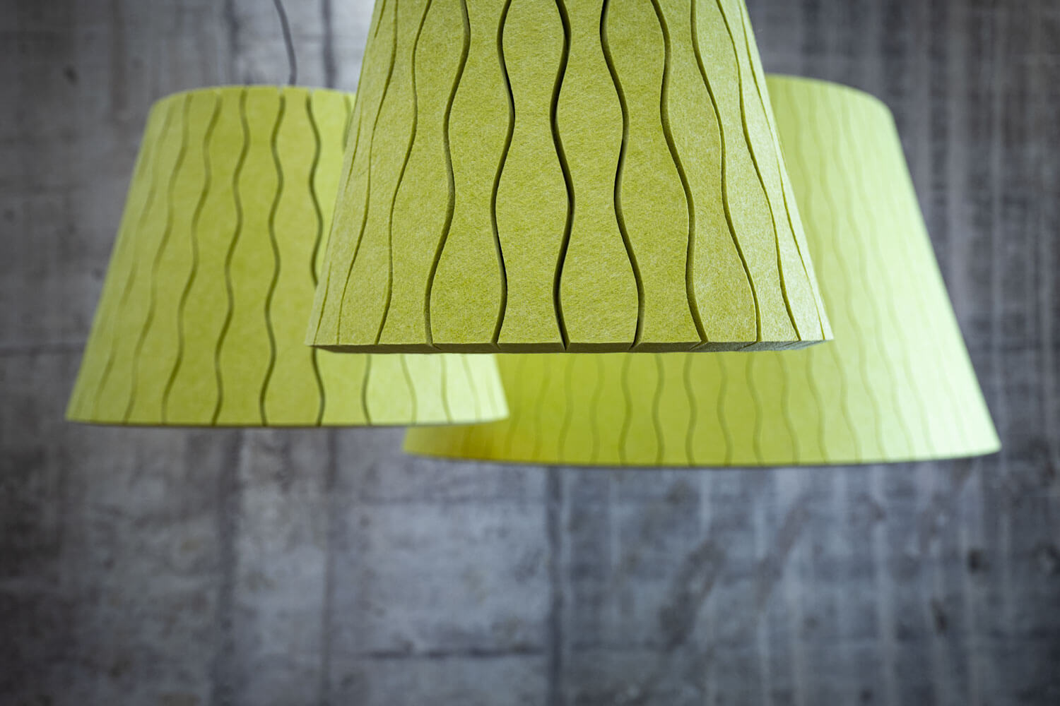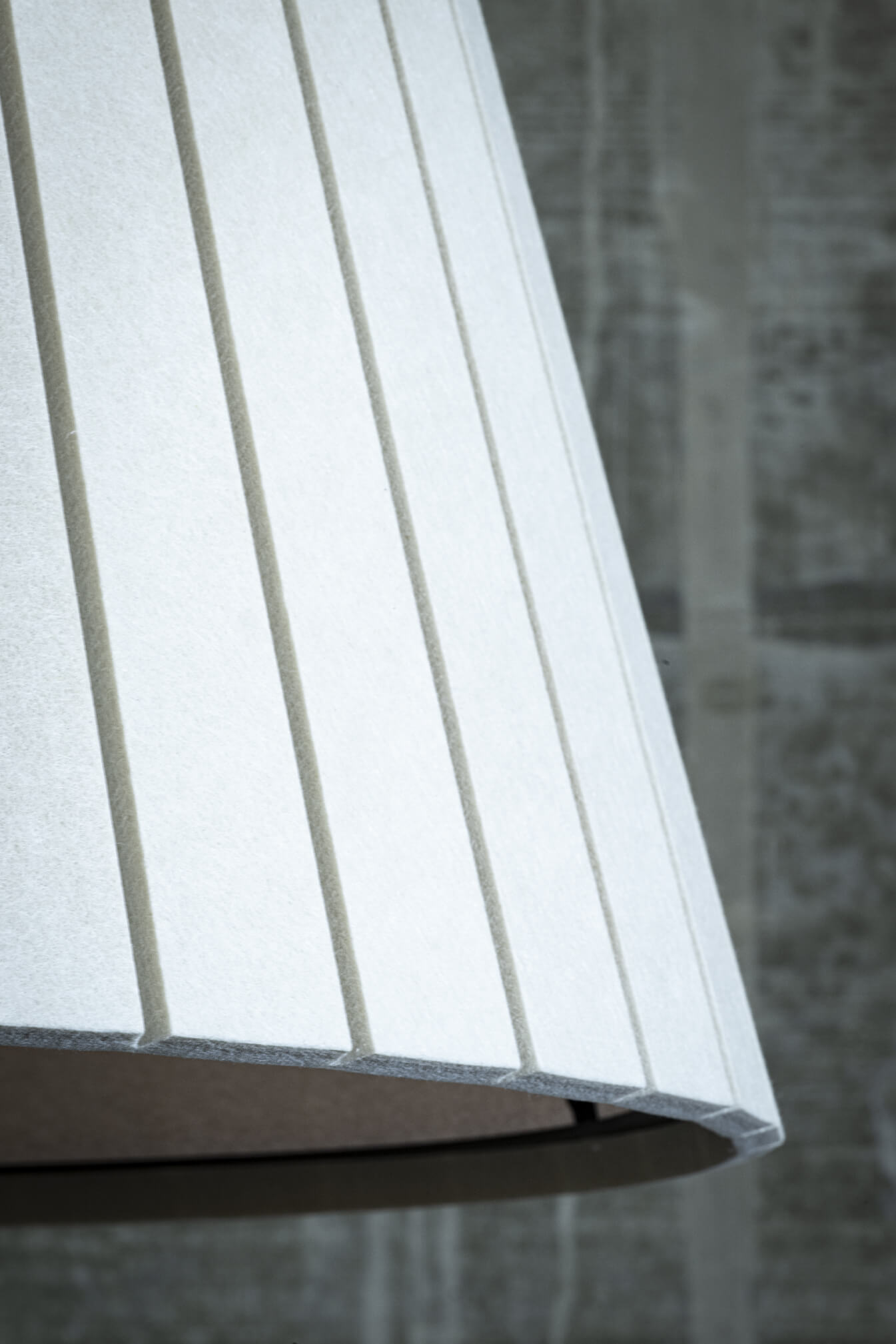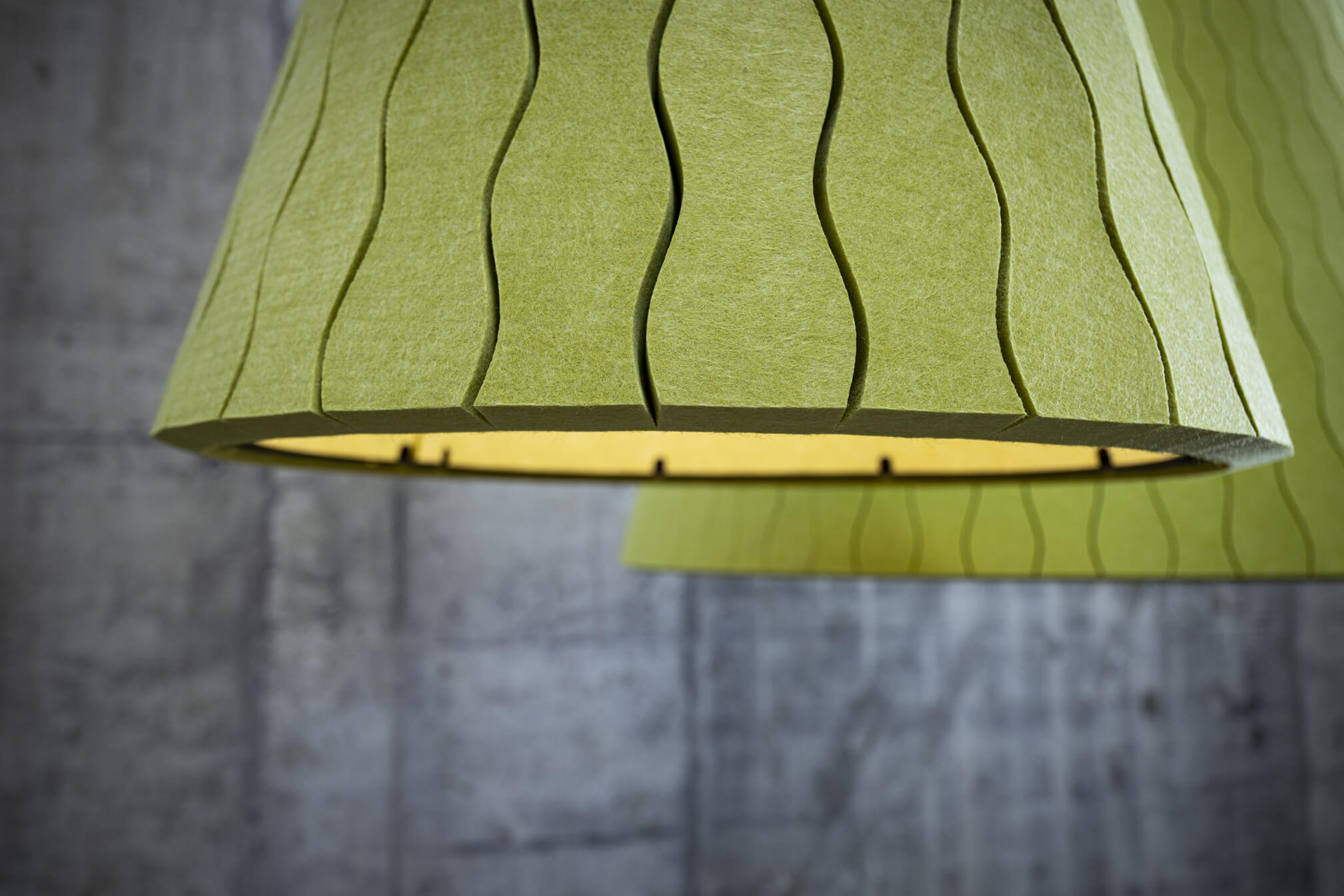 EchoLED ® CONE est disponible en cinq tailles. Son abat-jour en matériau acoustique PET contient jusqu'à 360 bouteilles PET recyclées. Ce plafonnier séduit par ses différentes épaisseurs de matériau, ses couleurs expressives et ses designs variés.