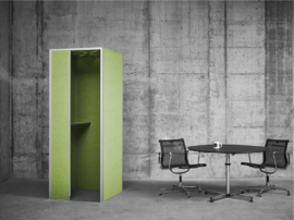 Une pièce dans une pièce pour des conversations courtes et ciblées, debout ou assis. Grâce à l’étagère réglable en hauteur intégrée, les documents ou l’ordinateur portable peuvent également trouver leur place. La cabine silencieuse peut être assemblée sans outils, ses sept pièces ne pesant que 42 kg.