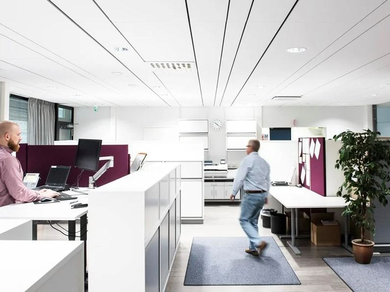 Ecophon Focus™ Lp est un système de plafond à ossatures semi-encastrées pour mettre en évidence la direction principale d’une pièce. Entre deux dalles, on distingue un joint large dans le sens de la longueur de la pièce et un joint plus étroit dans le sens de la largeur de la pièce. Le système est constitué de dalles de plafond standard Focus Lp et de dalles techniques Focus Lp.