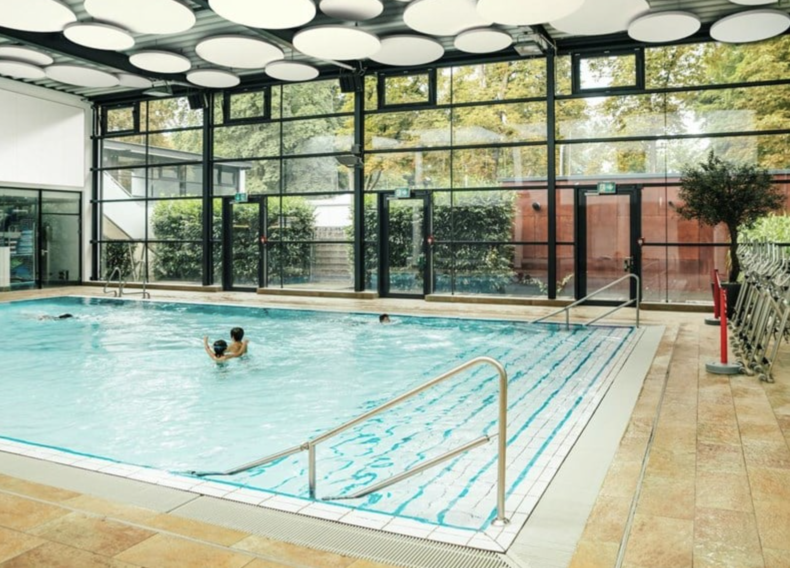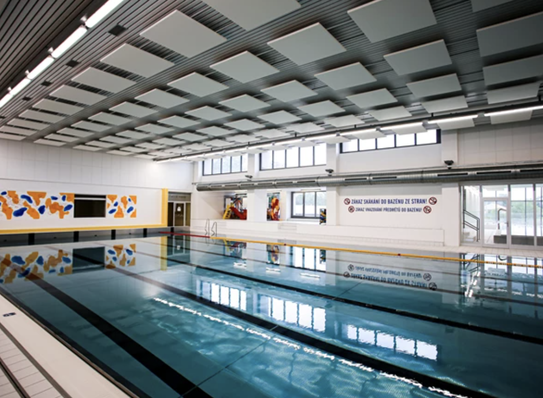 Ecophon Akusto™ Wall C Akutex HS est sans profils apparents et les bords chanfreinés forment un grain d’orge discret entre chaque panneau. Système bien adapté pour les halls de bassins de piscine, compatible avec les ambiances de forte humidité relative et de corrosion, et résiste aux projections directes d’eau occasionnellement.