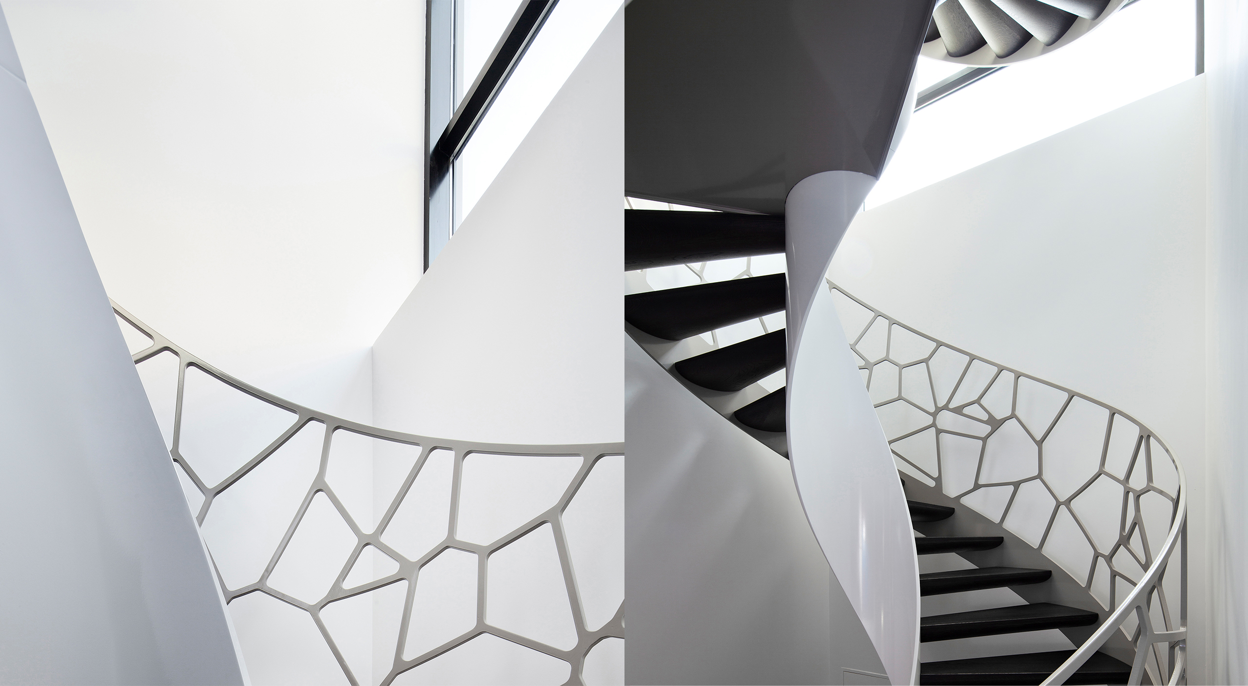 Les garde-corps Cells™, une innovation exclusive d’EeStairs, allient art et géométrie d’une manière élégante et inattendue. La conception organique à armure ouverte du garde-corps en acier Cells™ est dérivée de diagrammes de Voronoï générés par ordinateur, qui forment un « tissage » fluide de cellules en acier découpées au laser.