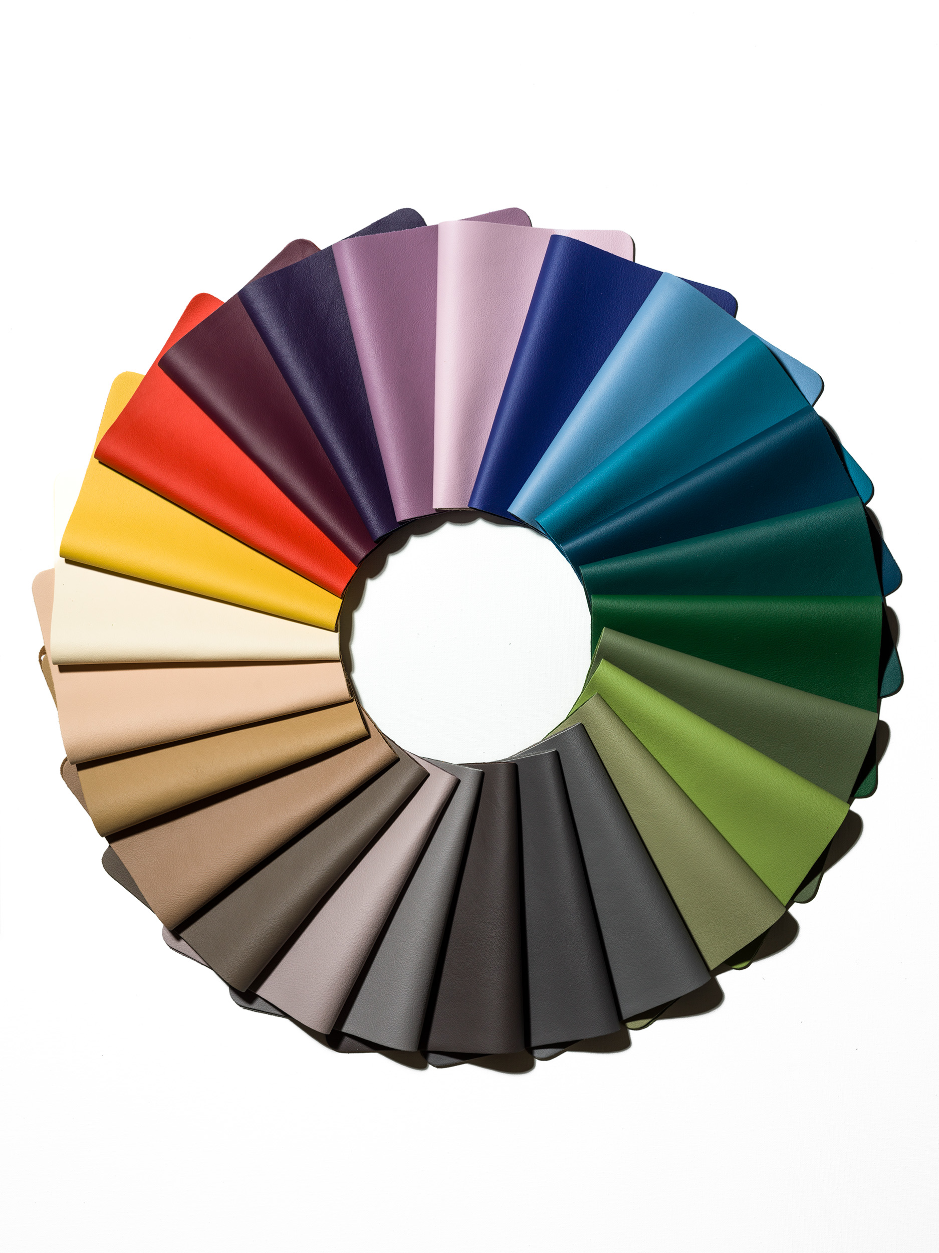 Cuir fleur de bovin scandinave. Tous les cuirs Elmo sont teints dans la masse et testés dans le laboratoire Elmo.