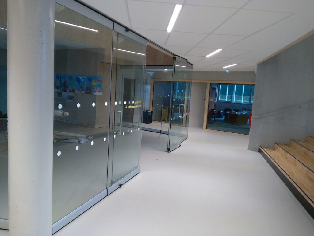 Eole réalise votre cloison mobile vitrée adaptée à vos besoins : possibilité de combinaison avec des panneaux fixes, d’ajouter une porte ou encore réalisation possible de cloisons vitrées à pans coupés etc. Le mur mobile vitré est également proposé dans une version acoustique : nous vous invitons à consulter notre cloison mobile vitrée acoustique MOVISTA.