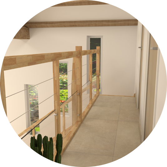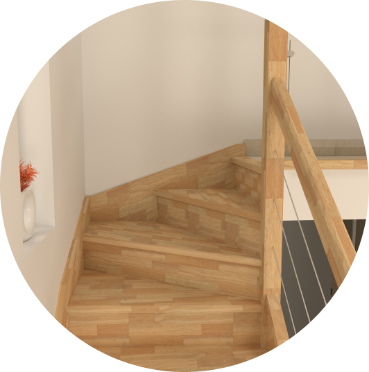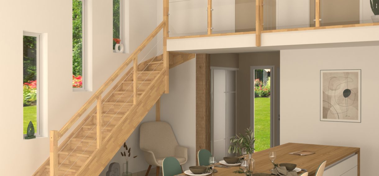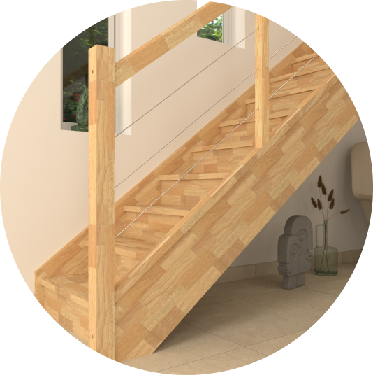 L’escalier AUDACE associe un escalier 100% bois avec un garde-corps à câbles inox horizontaux. Cette association confère beaucoup de légèreté et de modernité à l’ensemble.