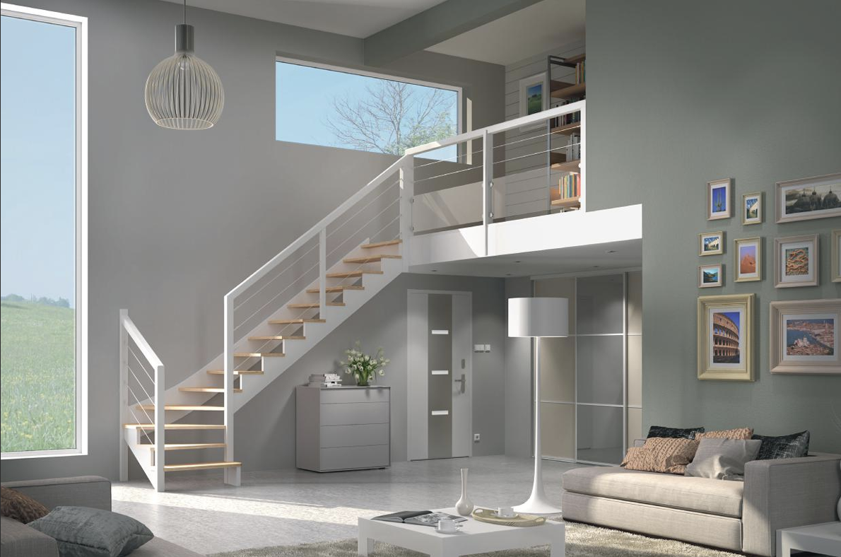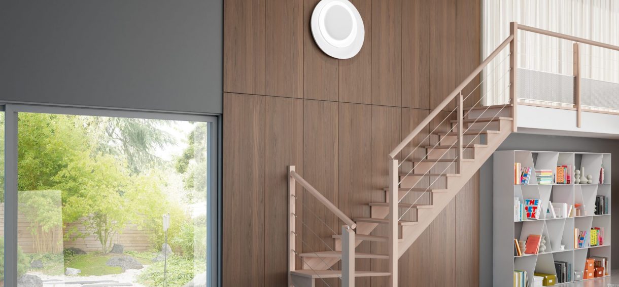 Associant un escalier à crémaillère 100% bois avec un garde-corps à câbles horizontaux, l’escalier SYMBIOSE se distingue par son élégance discrète.