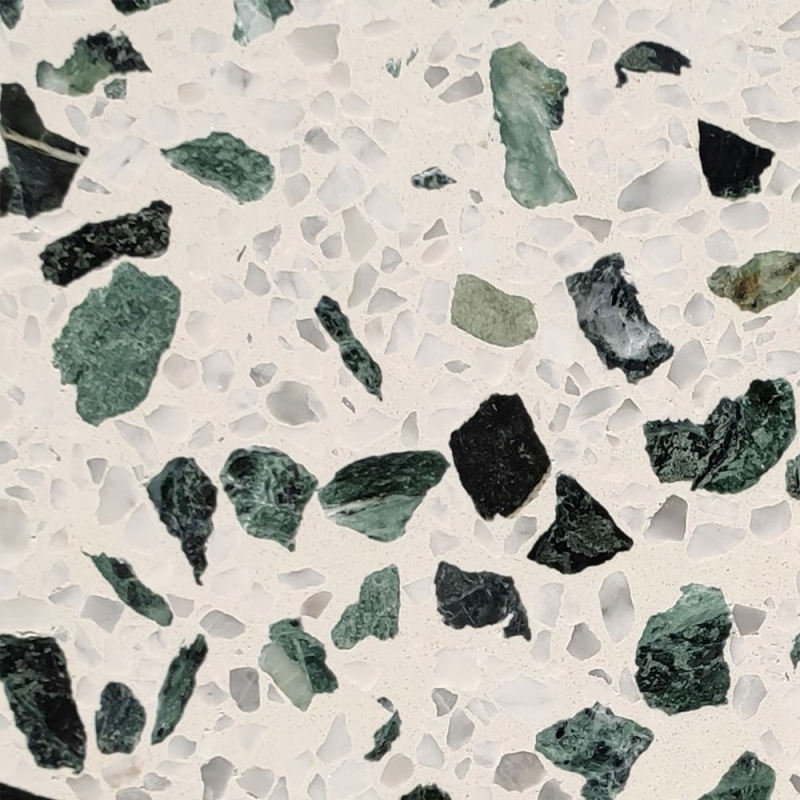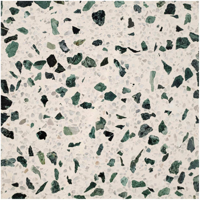Fabriqué à partir de ciment et fragments de marbre, le carreau terrazzo Aganippe 32 présente un assemblage graphique. Irréguliers et nuancés, de grands éclats de roches vert foncé contrastent avec le fond clair et lumineux. Les teintes franches apportent une allure contemporaine au revêtement.