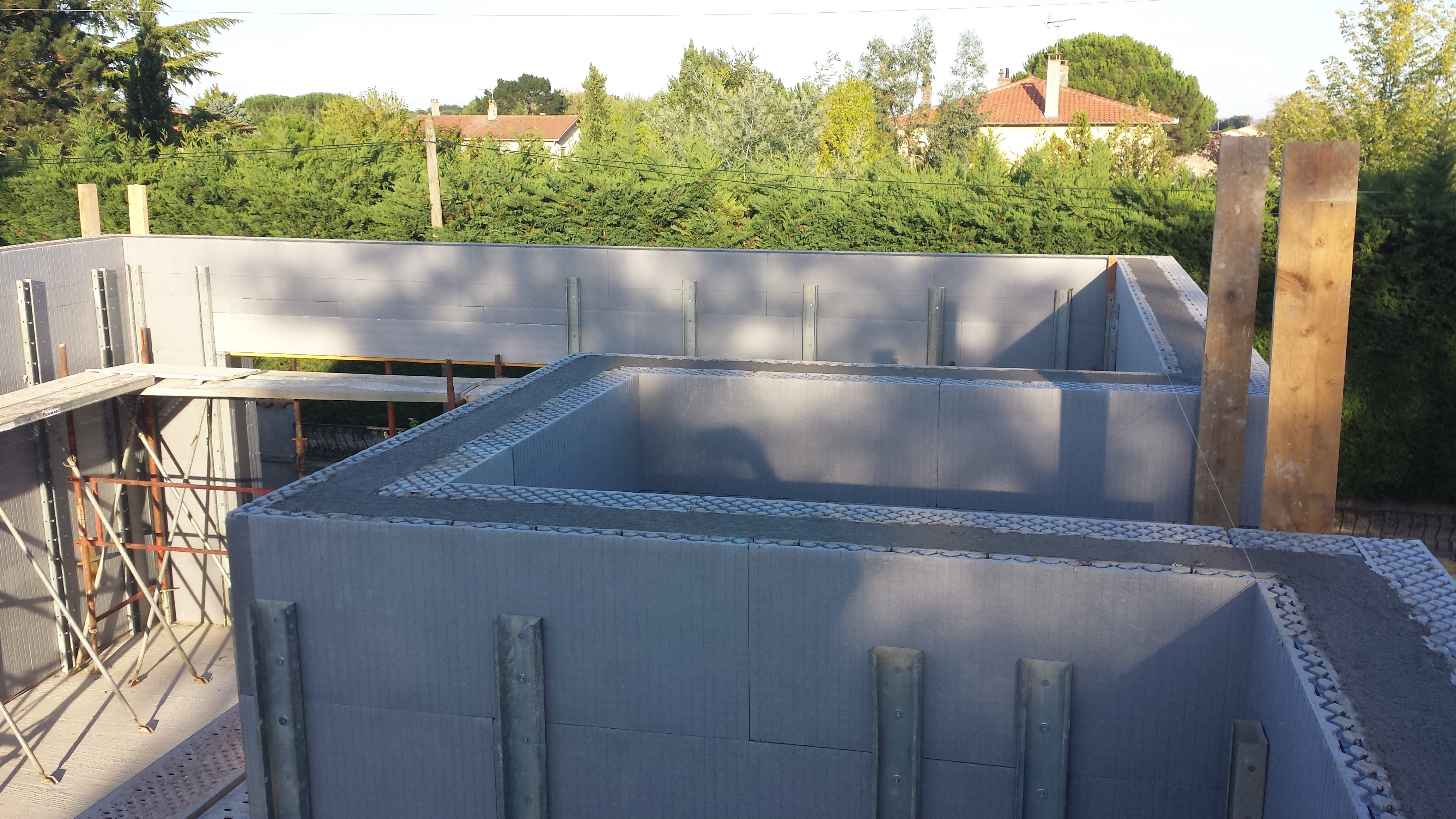 Le coffrage du mur est constitué par des planelles isolantes extérieures et intérieures reliées entres elles par des écarteurs (entretoises) des 160 ou 190mm.