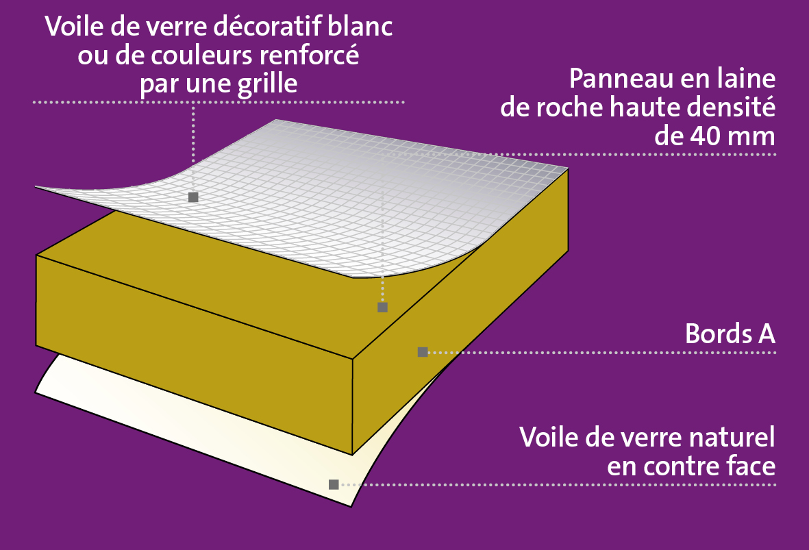 Panneau rigide autoportant en laine de roche, voile de verre décoratif renforcé par une grille.