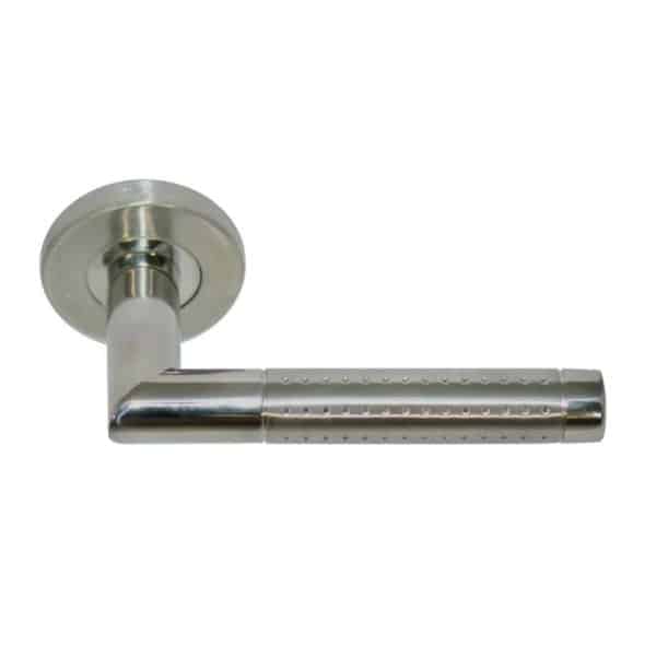 Poignée de porte en angle droit, en inox bicolore brillant et mat, décorée de poinçons, avec ressort de rappel sur rosace ronde.