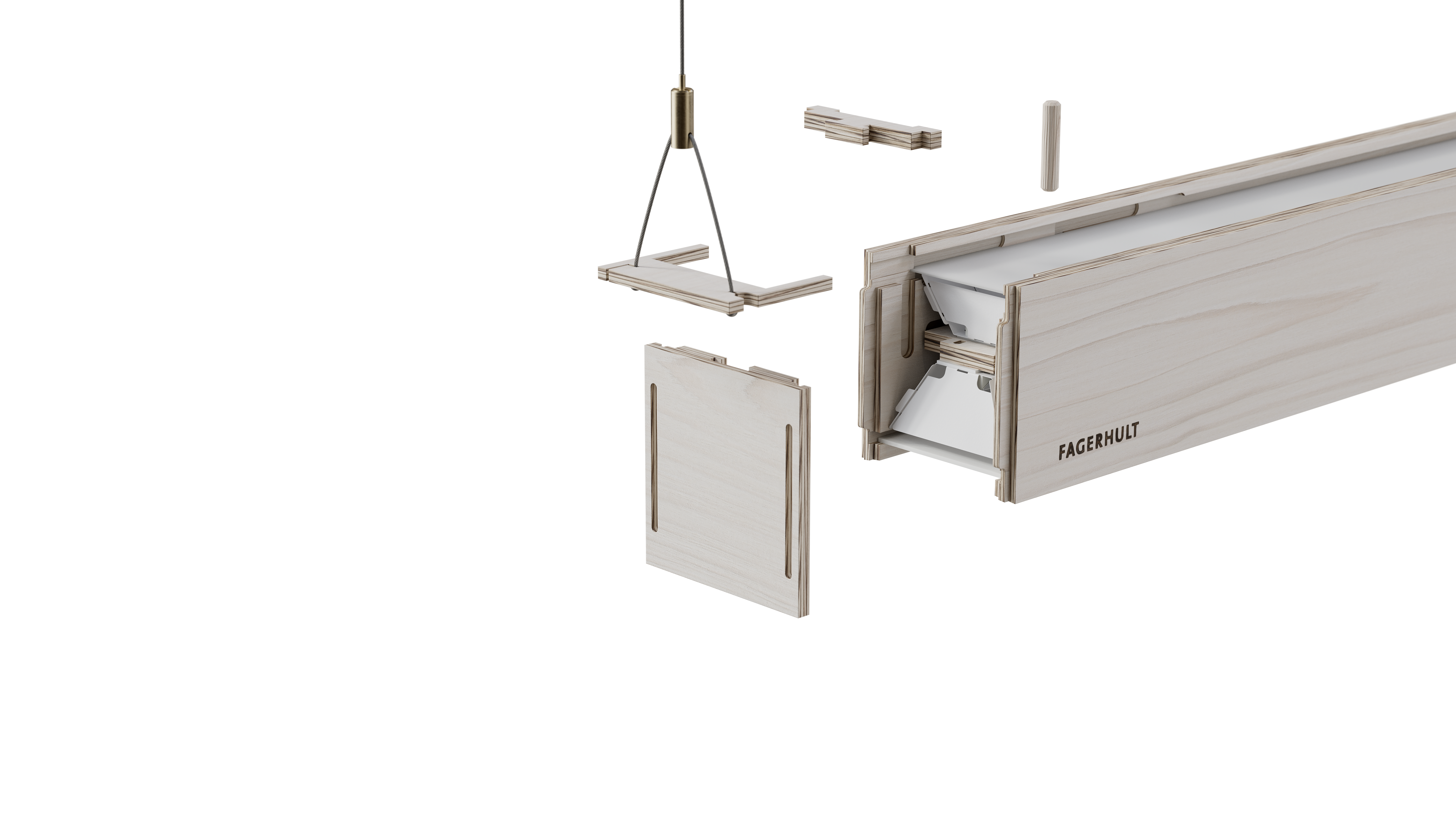 Tout au long du processus de conception, des choix forts ont été faits pour pouvoir changer nos manières de faire. Kvisten est composé de 77 % de matériaux recyclés ou renouvelables. Le corps est en contreplaqué de pin et de bouleau, et nous avons réutilisé des téléviseurs hors service pour en faire des réflecteurs. La grille anti-éblouissement utilise à peu près moitié moins de plastique qu’un dispositif diffuseur Delta conventionnel.