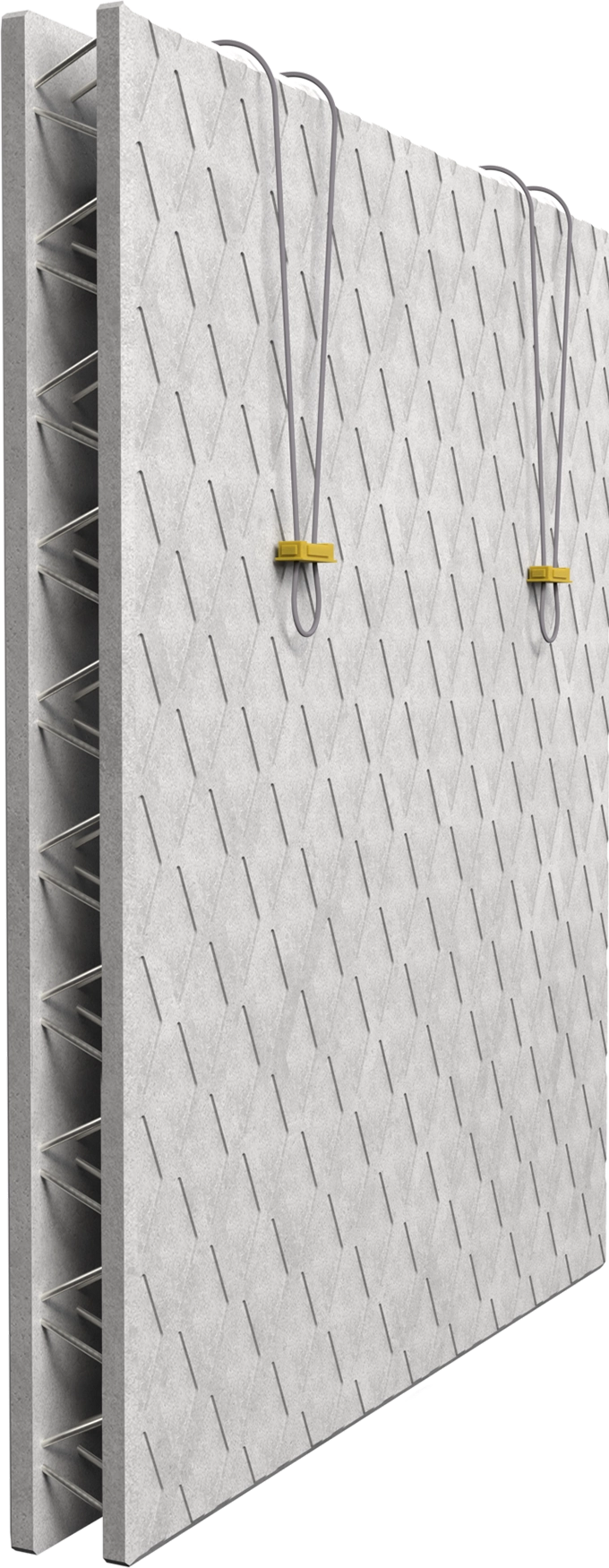 Le Précoffré® Architectural, mur à coffrage intégré, est constitué de deux parois minces en béton armé reliées et maintenues espacées par des raidisseurs métalliques et d’un vide central permettant le coulage du béton prêt à l’emploi.