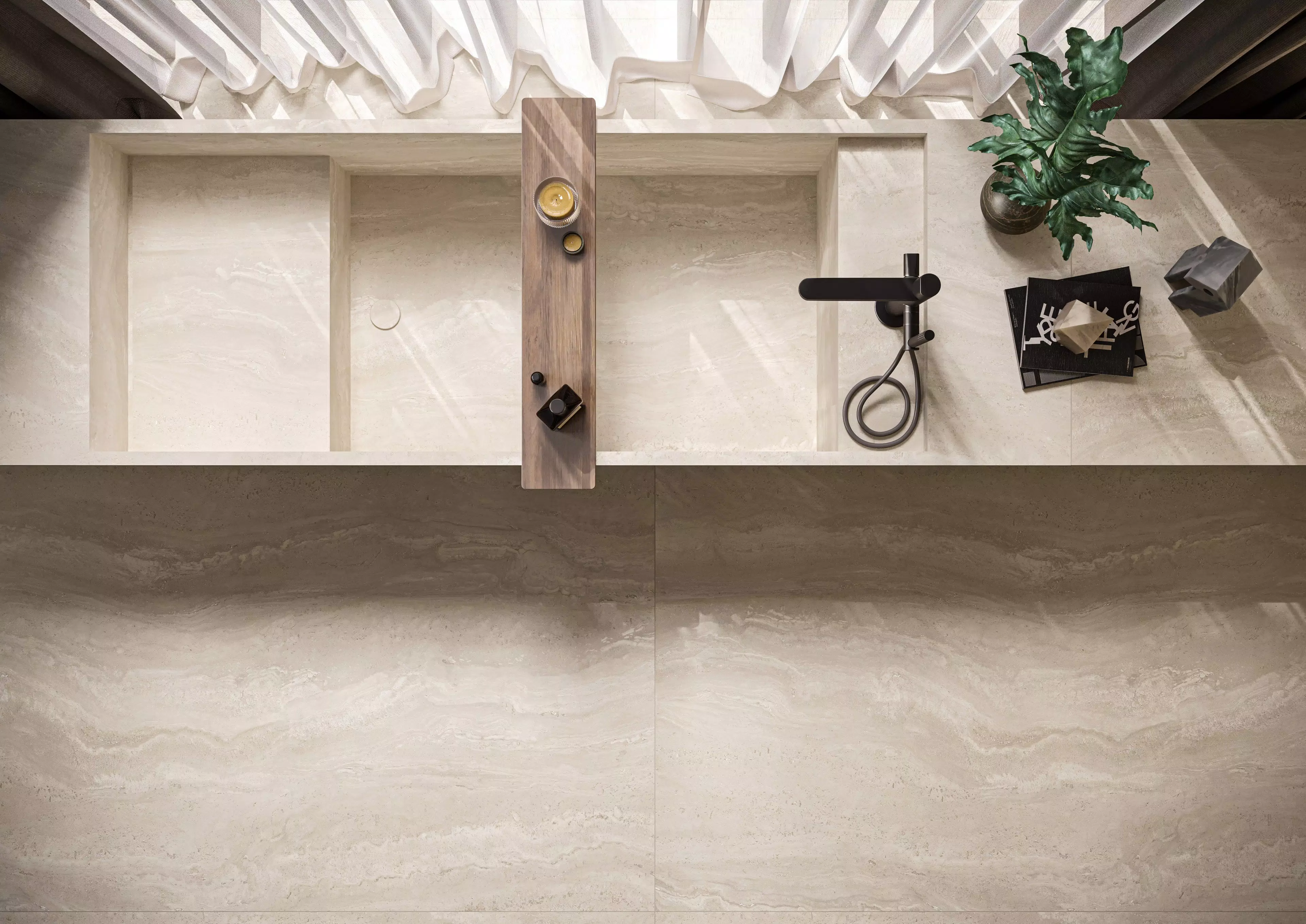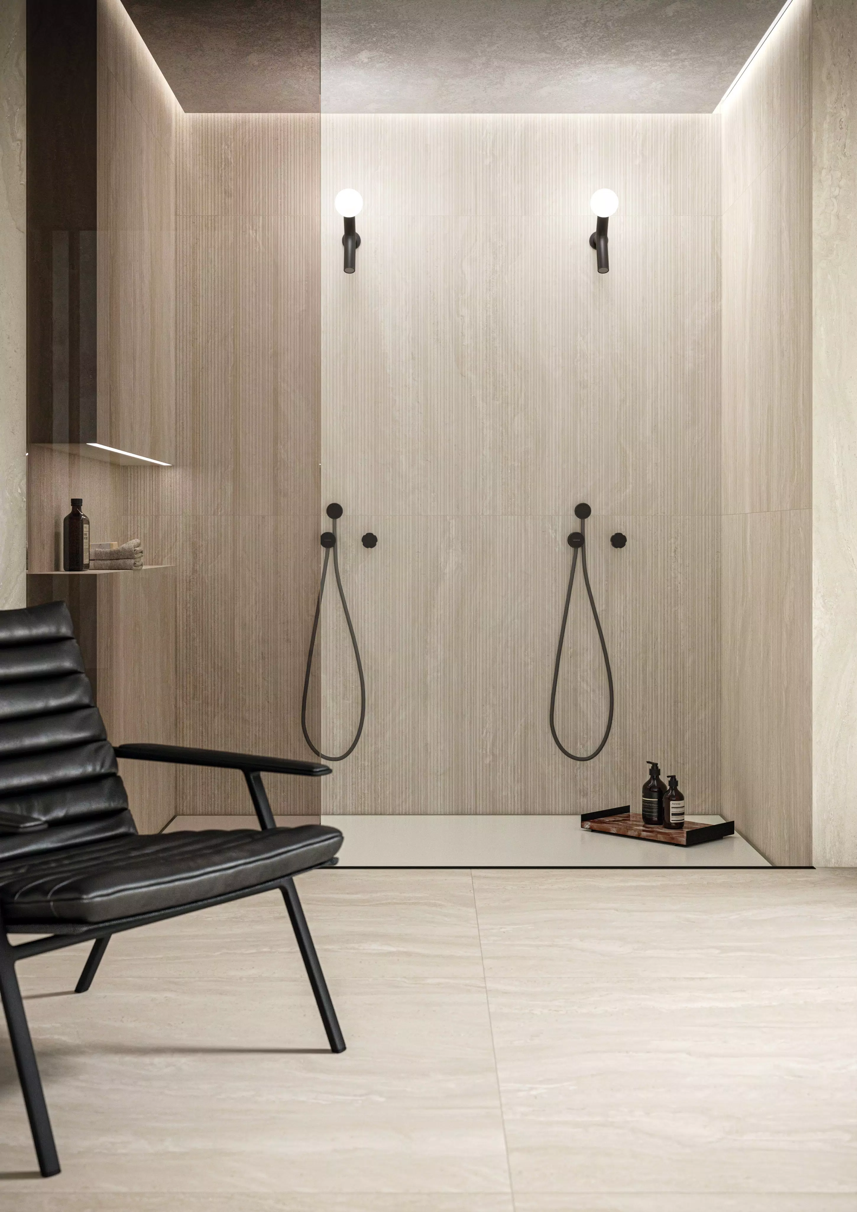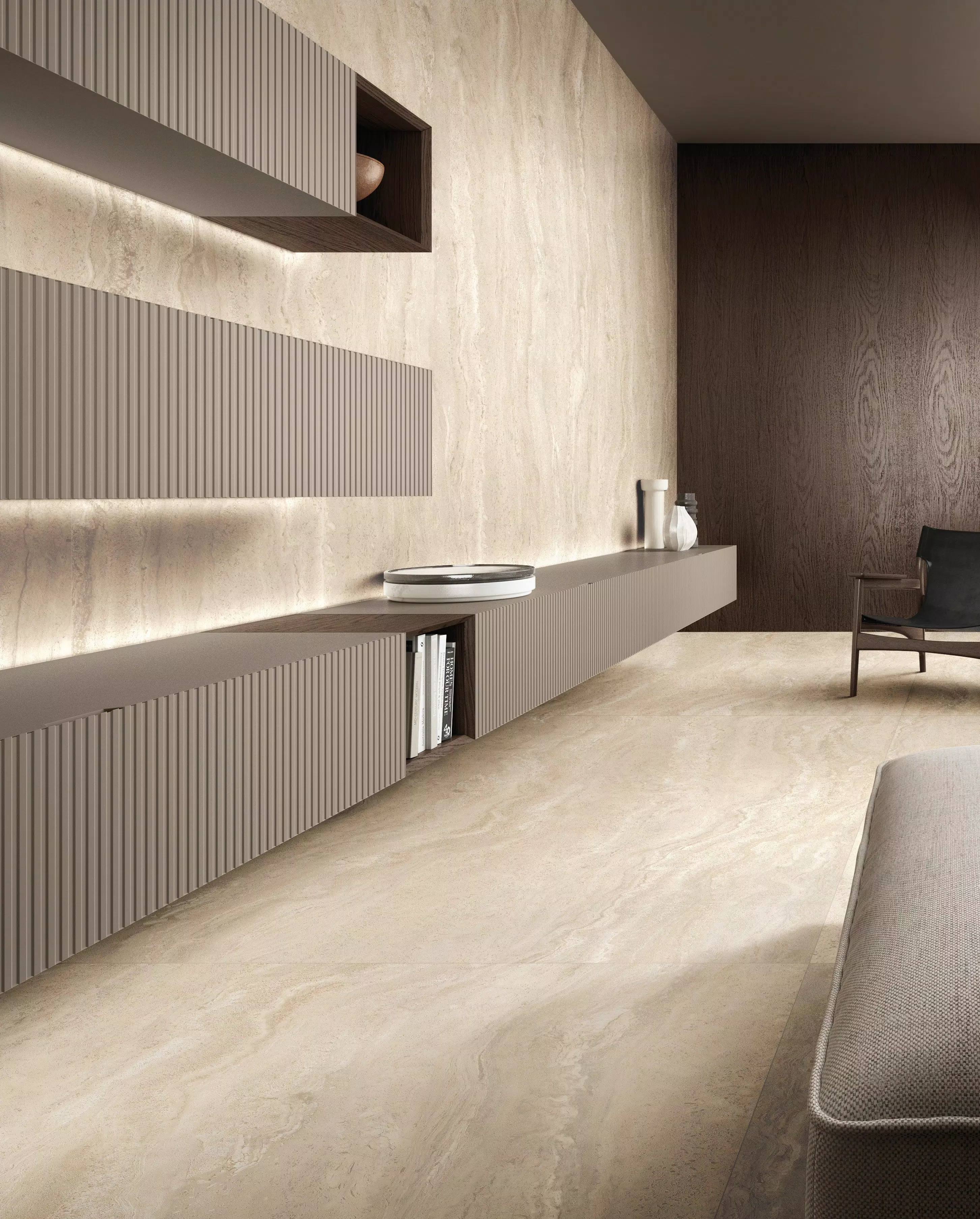 Travertins, pierres calcaires, marbres incarnent l'excellence des matières premières traditionnelles, répondant aux exigences esthétiques du présent. L'espace architectural s'enrichit de présences qui remplissent l'espace sans le dominer, mettant en valeur son caractère raffiné.