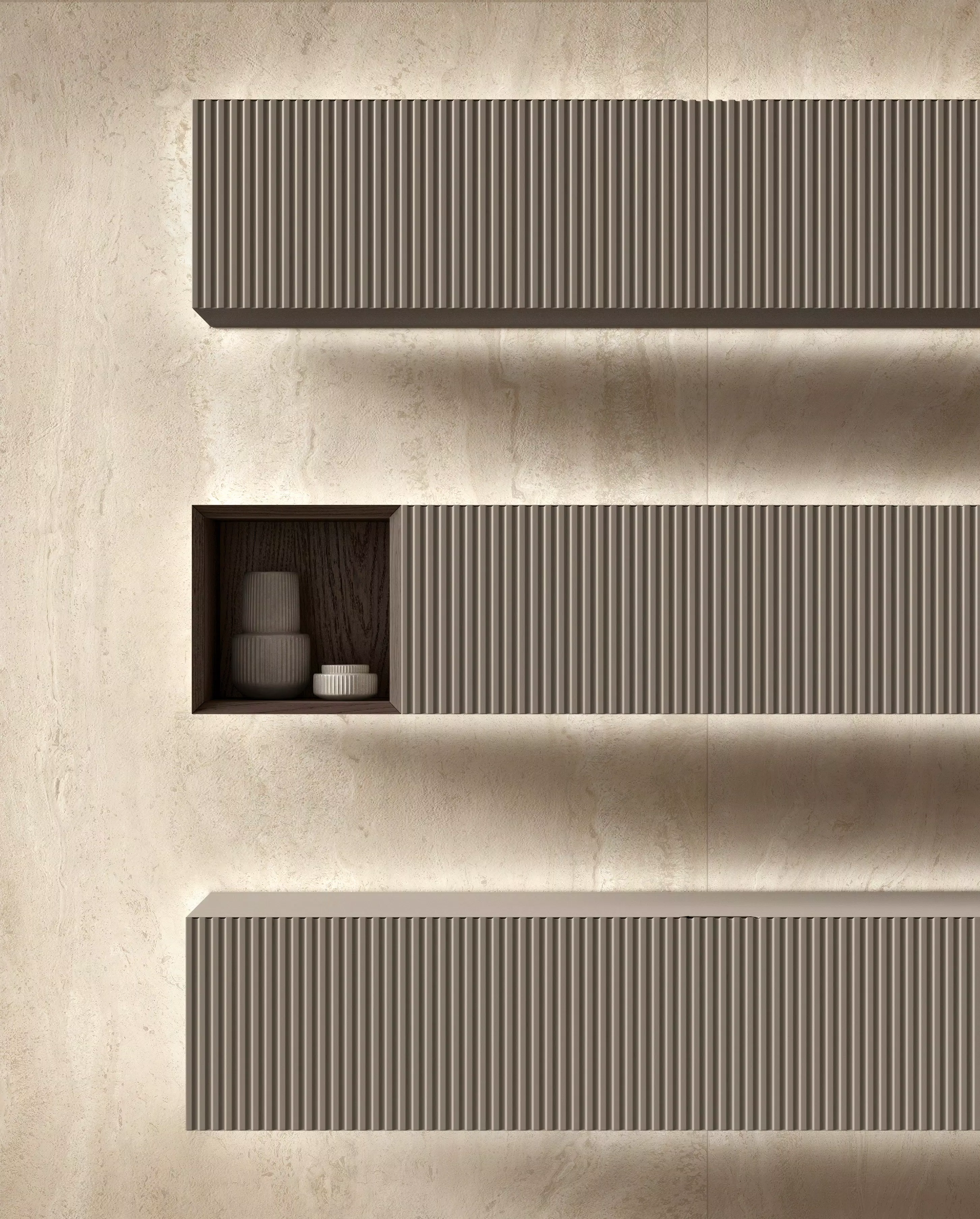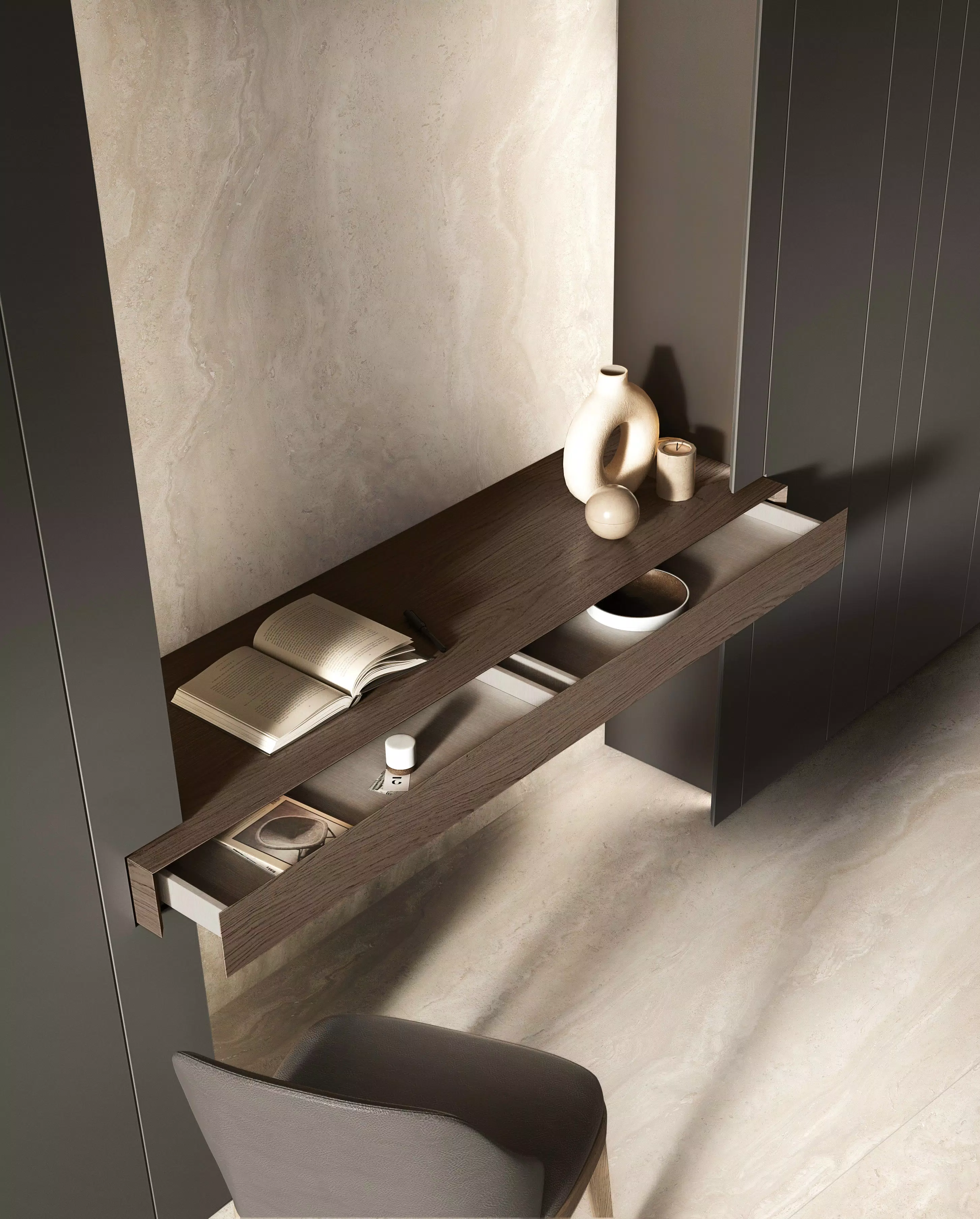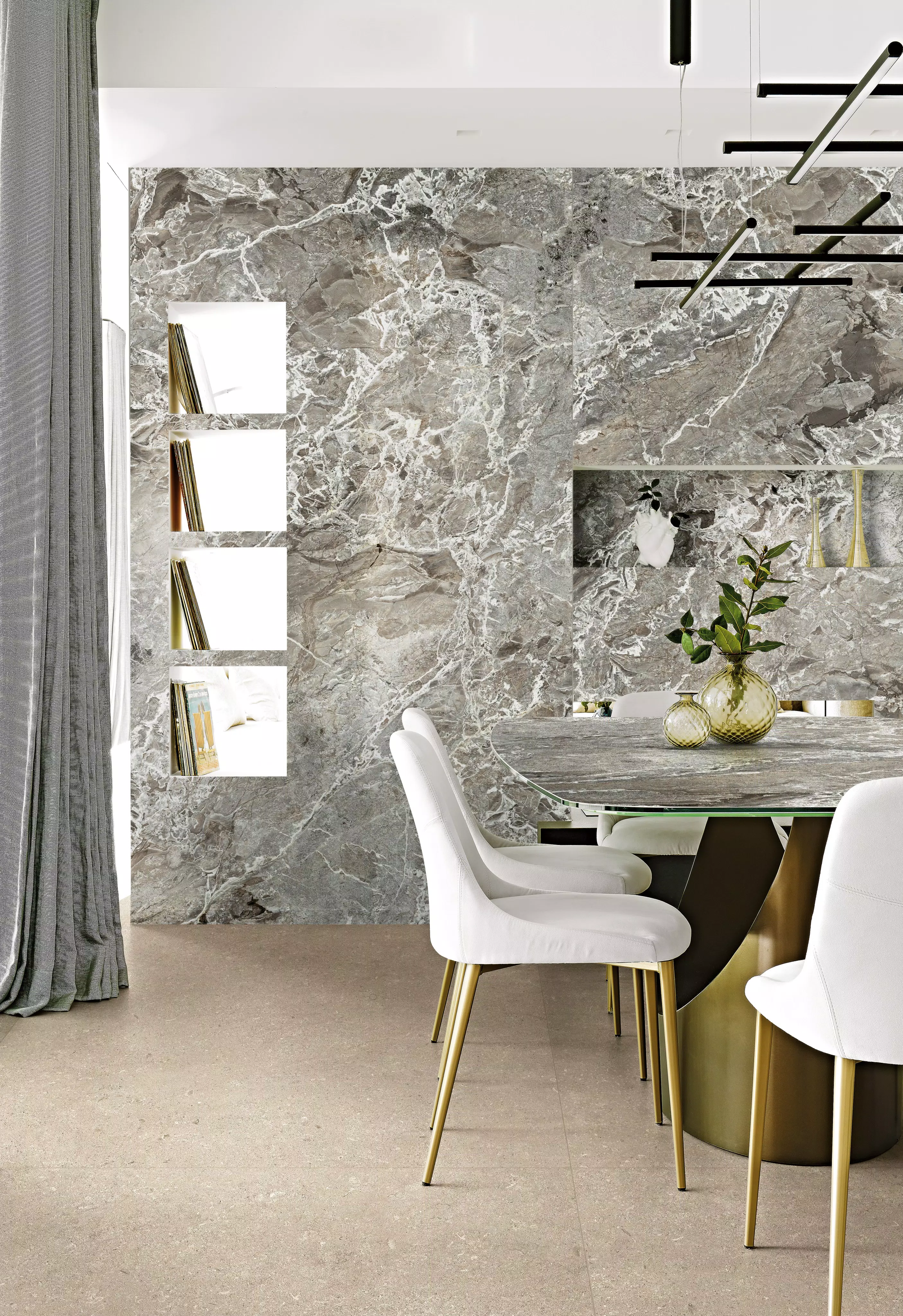 Travertins, pierres calcaires, marbres incarnent l'excellence des matières premières traditionnelles, répondant aux exigences esthétiques du présent. L'espace architectural s'enrichit de présences qui remplissent l'espace sans le dominer, mettant en valeur son caractère raffiné.