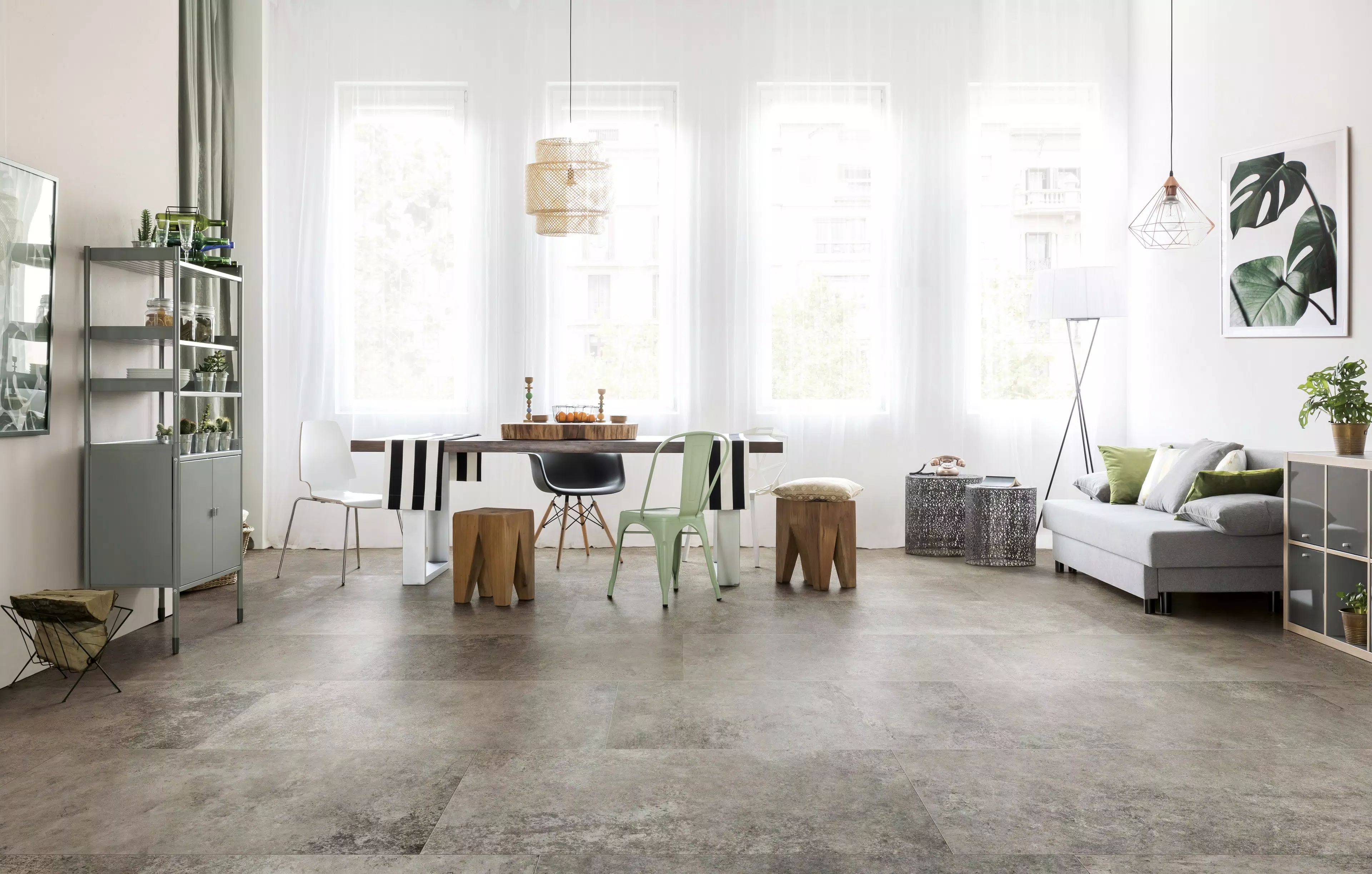 Le graphisme du béton dégradé est décliné en plusieurs tons neutres, allant du blanc au charbon, en passant par les gris et les beiges.