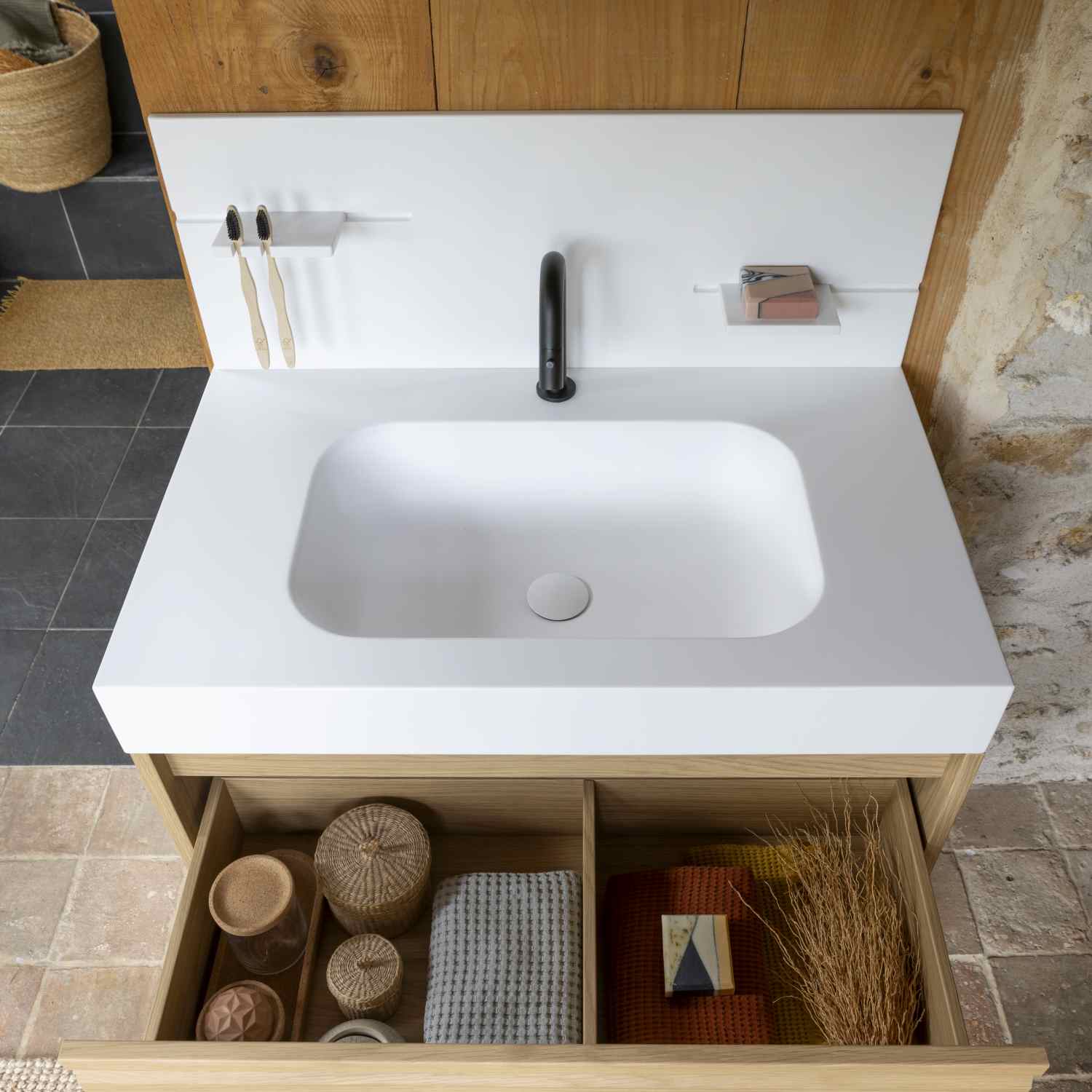 Fabriqué en matériau premium Solid Surface, type Corian®, notre plan avec vasque intégrée Tom, est conçu avec une vasque rectangulaire peu profonde élégamment sculptée par de très très larges rayons, créant une ligne épurée très tendance pour une apparence minimaliste et sophistiquée dans votre salle de bains. Associez-le avec un meuble sous-vasque Godmorgon, Angsjön et Havbäck d'Ikea pour un style luxueux et épuré.