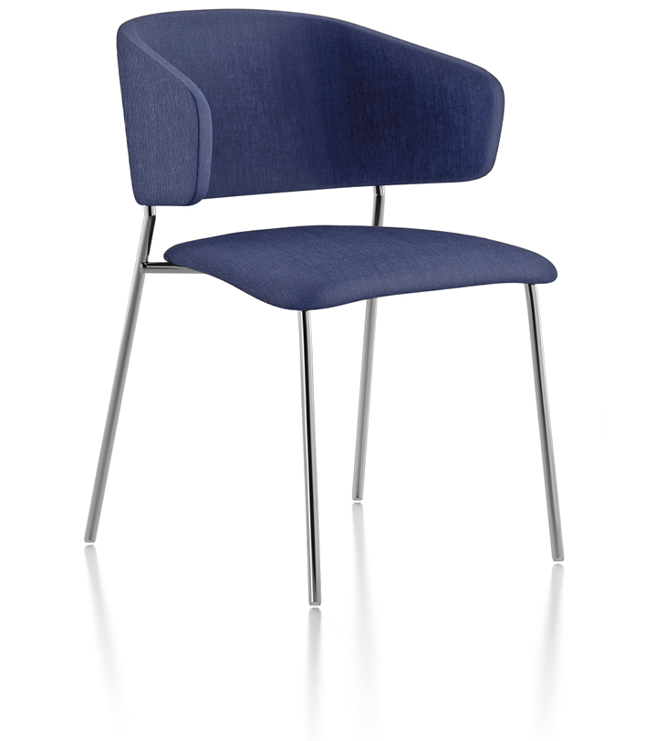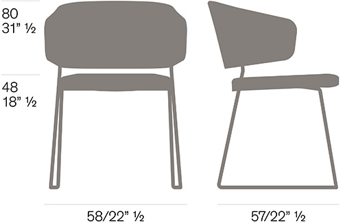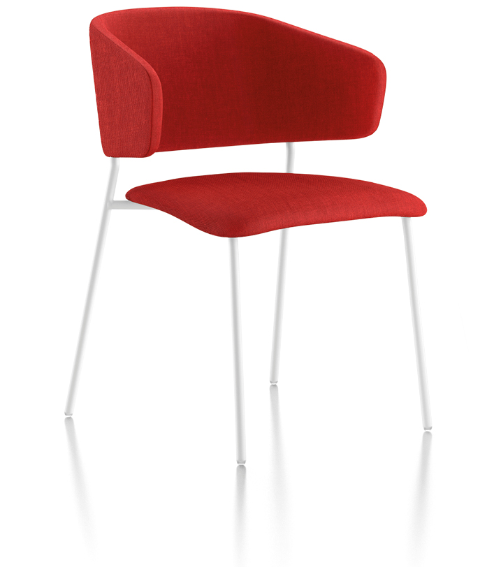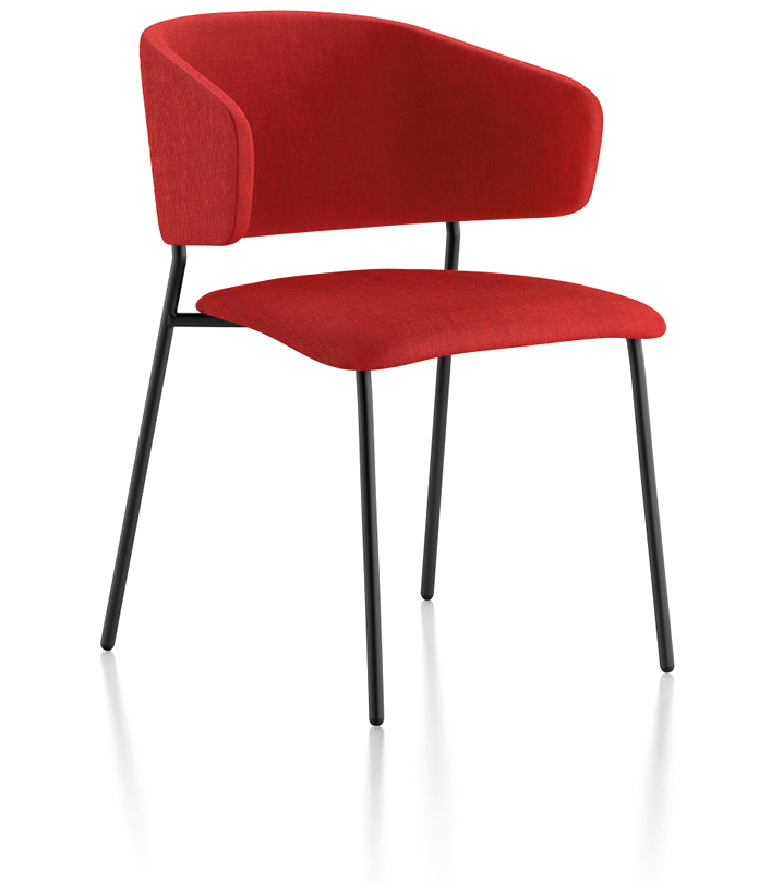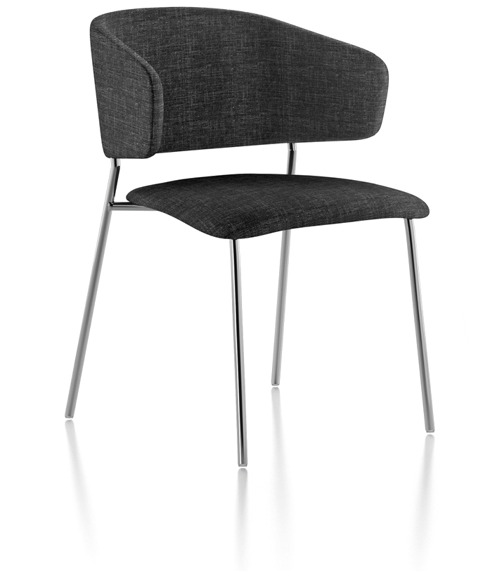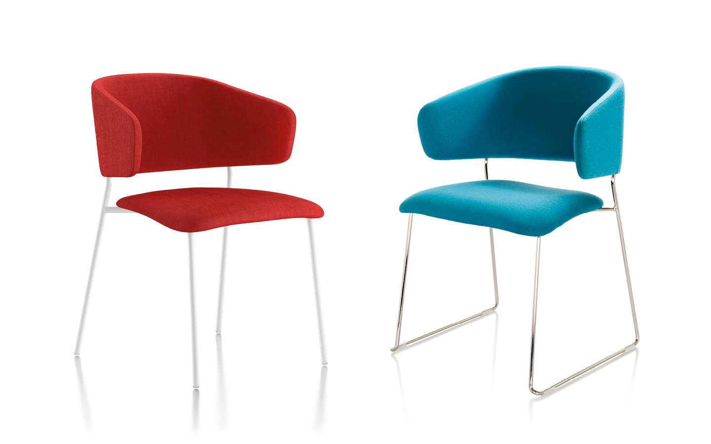 Fauteuil avec base de traîneau en acier chromé ou revêtu de poudre. Le siège et le dossier entièrement rembourrés sont disponibles en tissu, en cuir ecoleather ou en matériau du client.