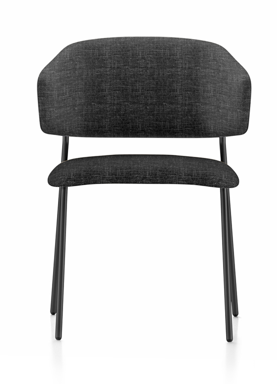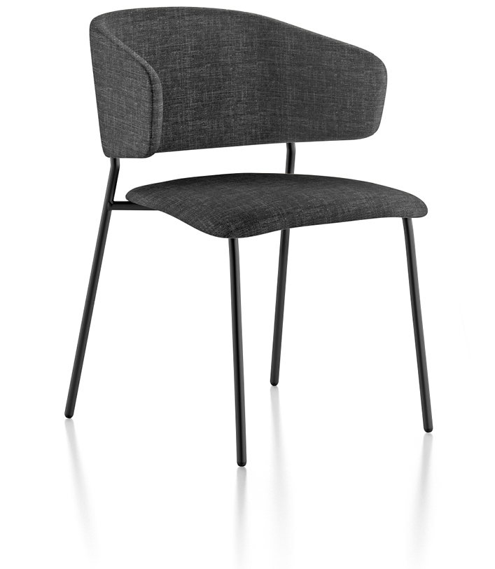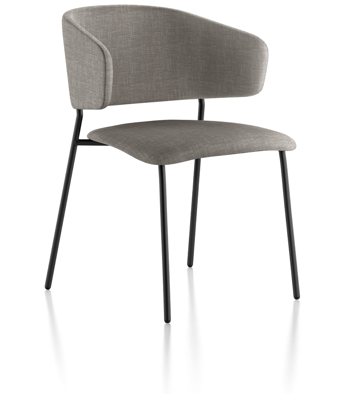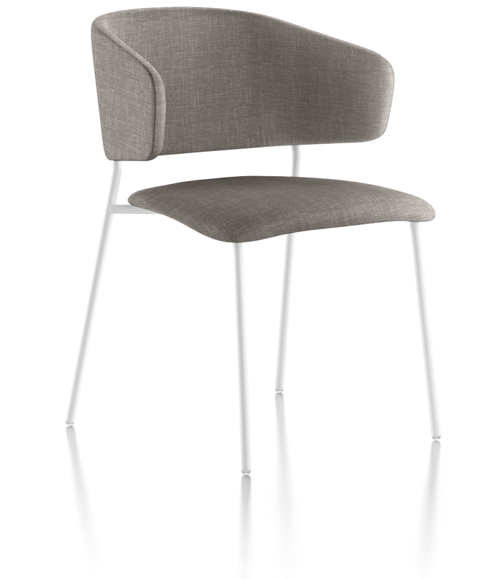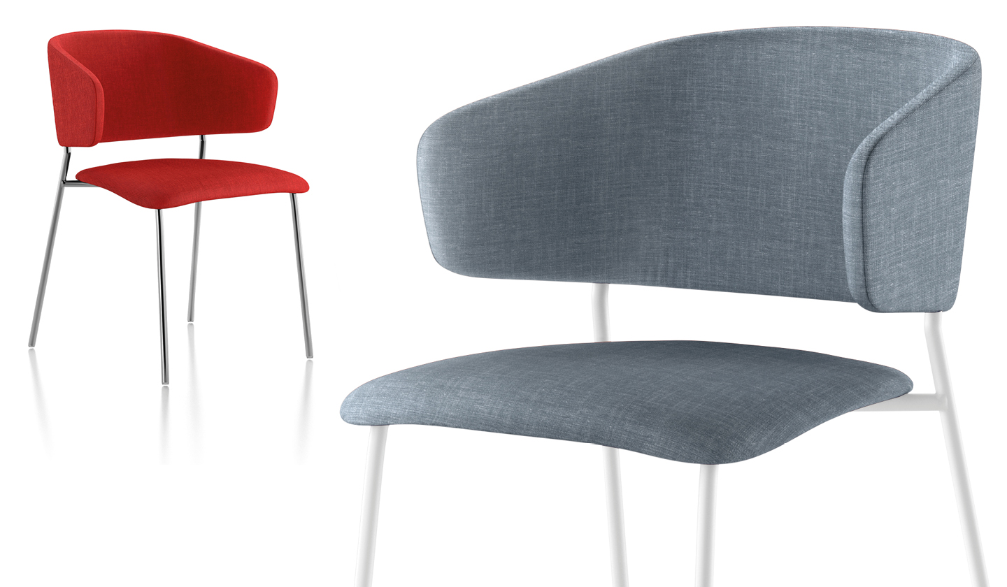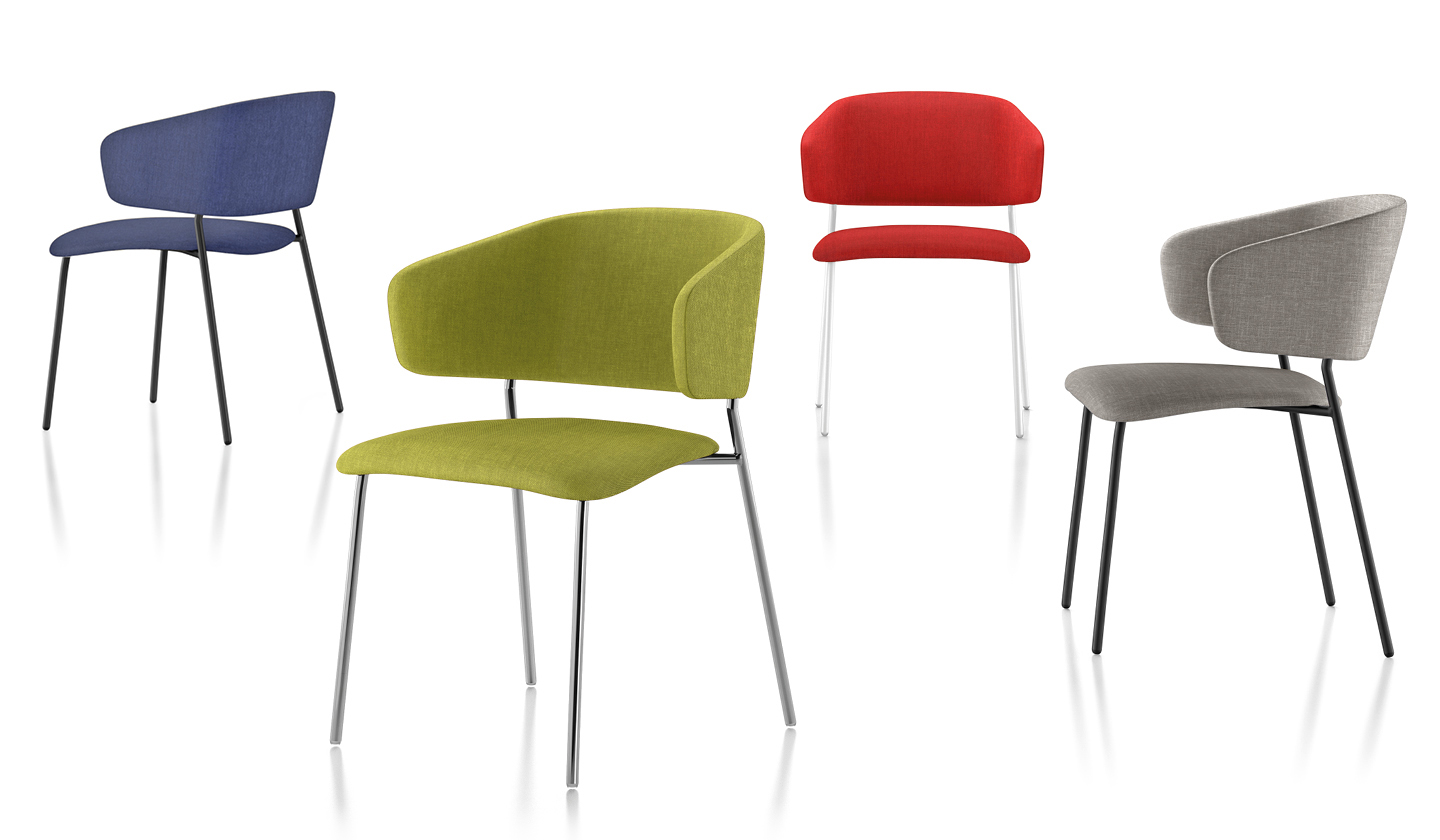 Fauteuil avec base de traîneau en acier chromé ou revêtu de poudre. Le siège et le dossier entièrement rembourrés sont disponibles en tissu, en cuir ecoleather ou en matériau du client.