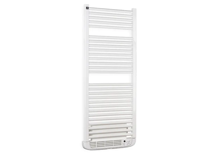 Le bas de l’appareil est équipé un boîtier de régulation de très faible épaisseur avec soufflerie intégrée à commande digitale, programmable avec détection d’ouverture de fenêtre, jauge et indication de consommation d’énergie en kWh. La grille de soufflage est orientable pour une mise en chauffe rapide de la salle de bain et le séchage du linge.