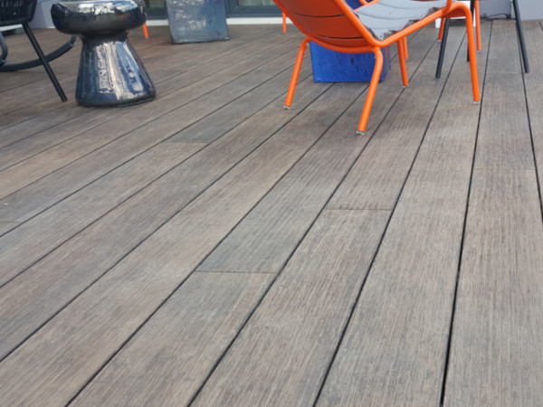Les revêtements de sols en bambou densifié sont une solution qui permet l'utilisation du bambou dans un format standardisé, plus durable dans le temps grâce au processus industriel de densification du bambou. L'impact carbone des produits existants n'est pour l'instant pas très intéressante au vu des 10 % de colle et du transport depuis la Chine.
