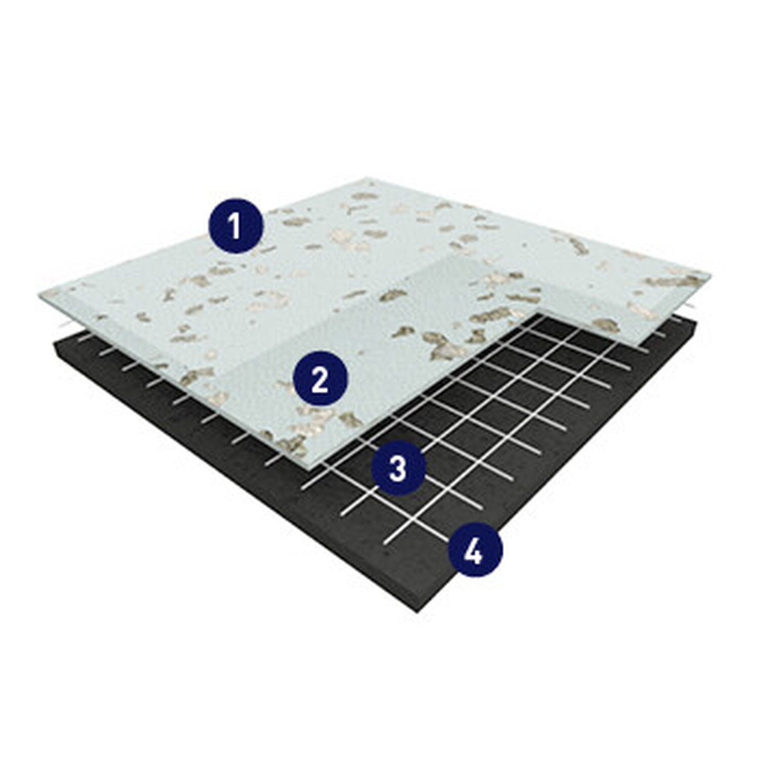 Il est constitué d'un décor dans la masse à finition mate, sans charge, sans couche d'usure transparente, obtenu par pressage très haute pression (800 tonnes) de particules dans toute l'épaisseur de la couche d'usure.