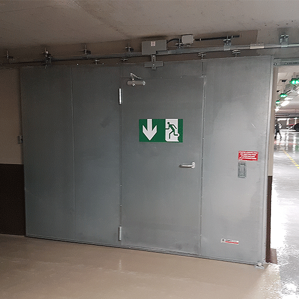 La porte coupe-feu coulissante C62 est une porte coulissante métallique à deux vantaux pare-flamme 1h. Elle est idéale pour compartimenter un parking.