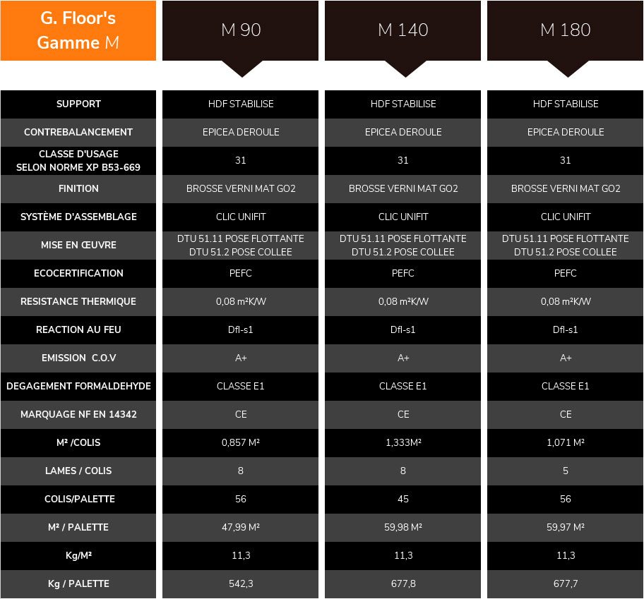 Le produit Gamme M de G.FLOOR'S est composé de : Bois et dérivés .