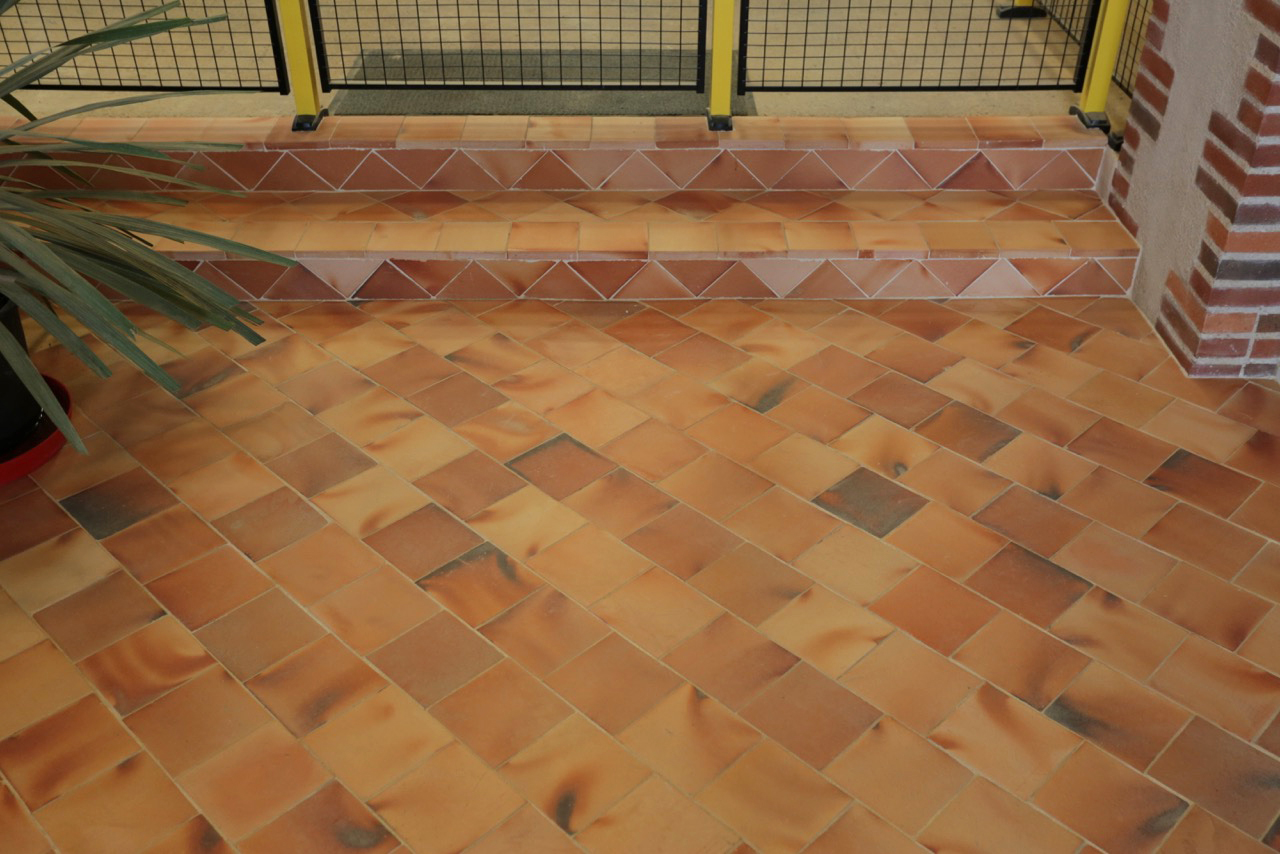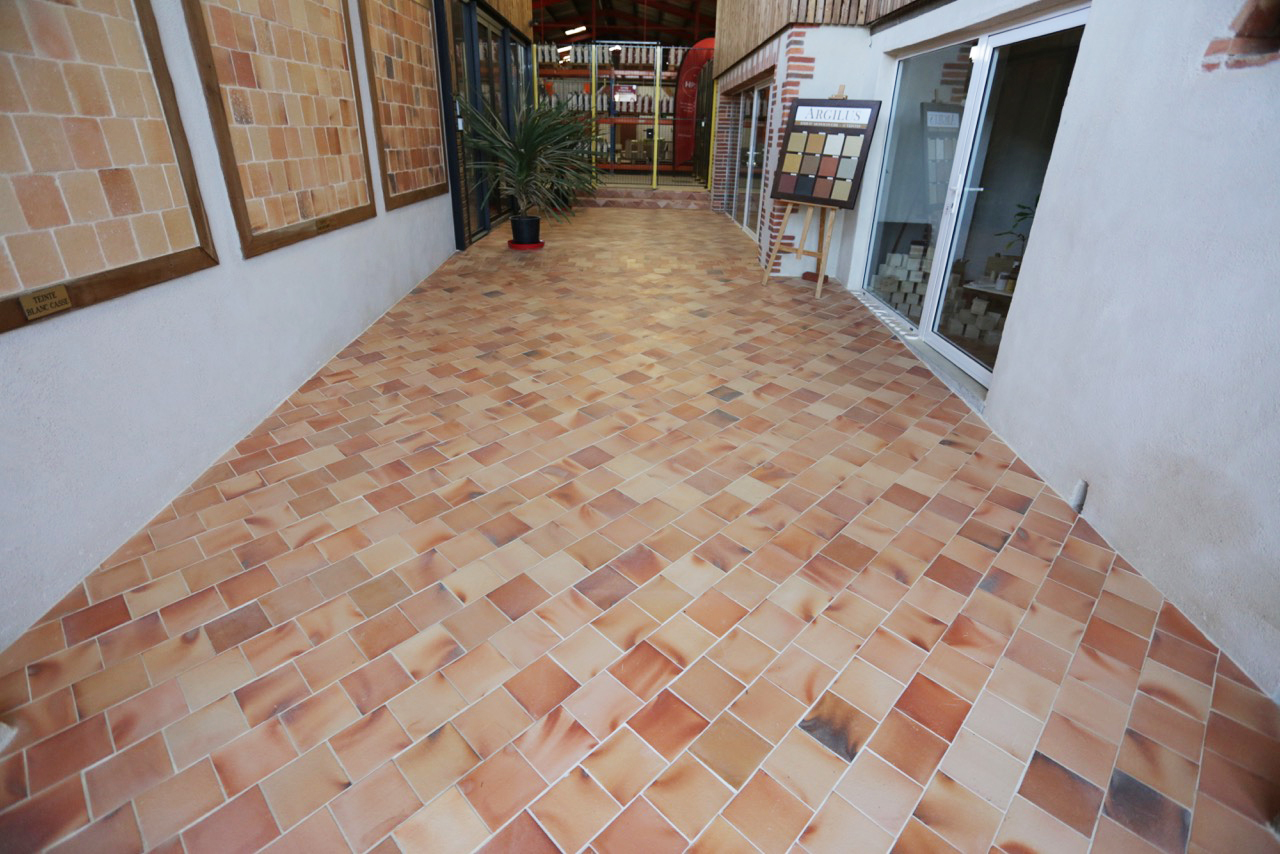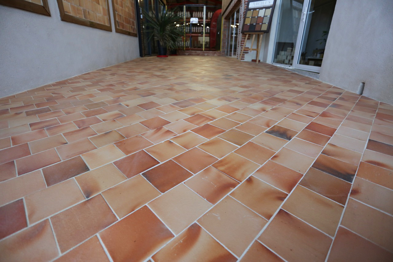 Ces carreaux se mettent en œuvre à la colle FLEX – Spéciale Terre Cuite – ou la chaux selon les spécificités du projet (voir conseil de pose). Un joint de 5 mm de moyenne et une pose « décalée » sont recommandés afin de récupérer les très légères irrégularités des carreaux. Ils se coupent à l’aide d’une disqueuse avec disque diamant à sec ou à eau.