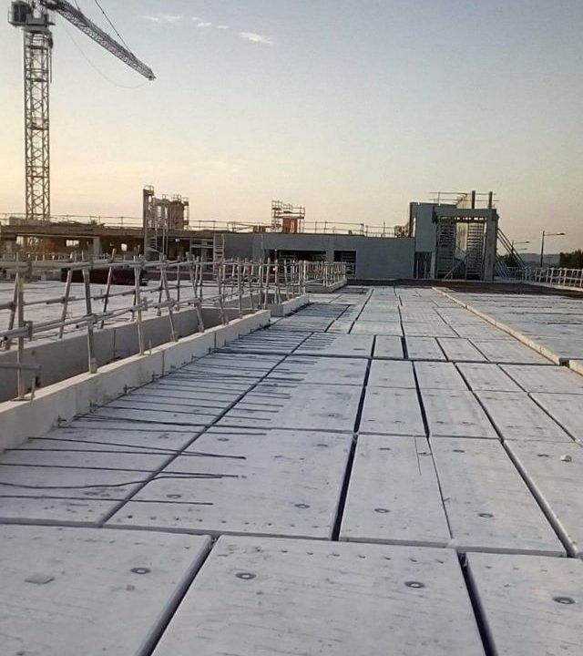 Les plaques alvéolées et plaques TT sont posées sur des poutres maîtresses préfabriquées. Pour obtenir un rendement optimum, les dalles de compression sont coulées avec treillis et armature.