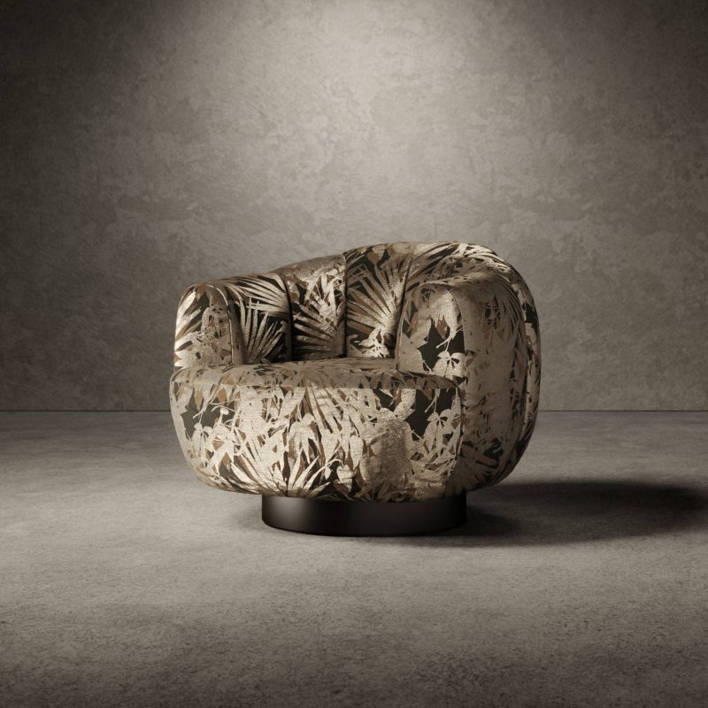 Le fauteuil Ornella est composé d’un cadre en bois rembourré de mousse de polyuréthane et recouvert d’une couche supérieure de fibre acrylique. Le dossier se caractérise par un grand matelassage vertical, tandis que des sangles élastiques accentuent le confort de l’assise. La base est en bois laqué noir mat et peut être recouverte d’un boîtier métallique avec des finitions en laiton brossé.