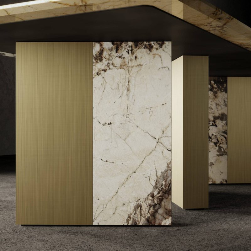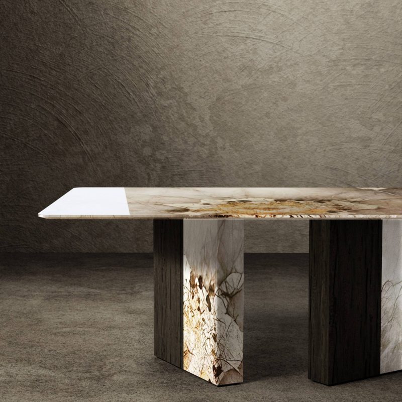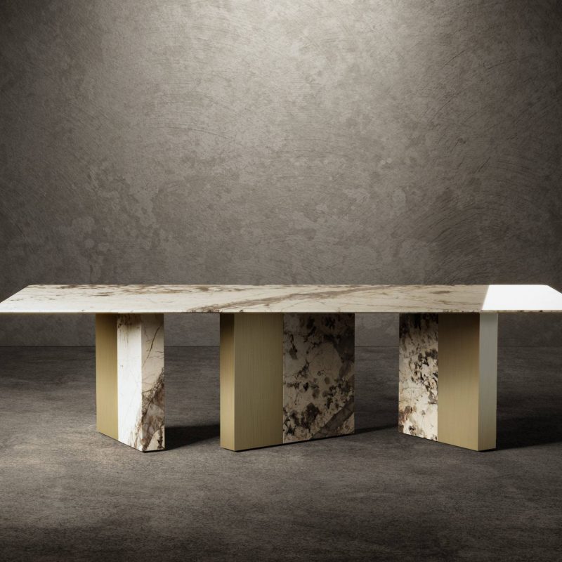 Chaque pied est recouvert d’une combinaison différente de dalles de marbre Patagonia et d’une finition en laiton brossé, en métal ou en bois de sapin noir.