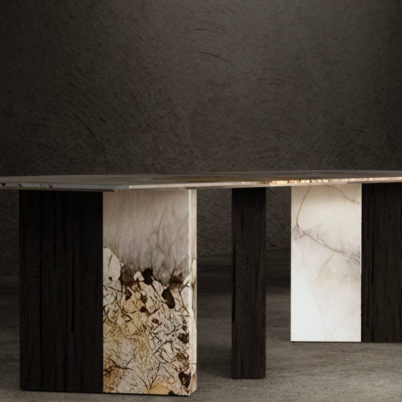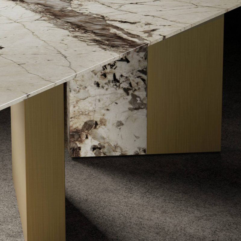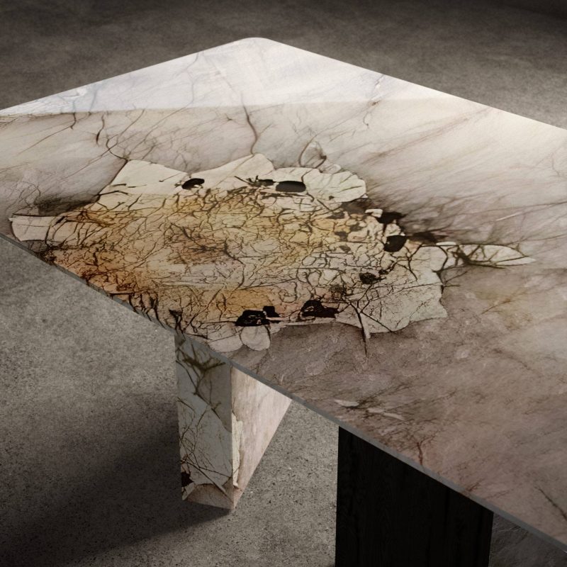 La table à manger One Way Or Another est composée d’un plateau en marbre de Patagonia taillé au diamant sur le bord inférieur, renforcé par un support métallique fixé à trois pieds asymétriques.