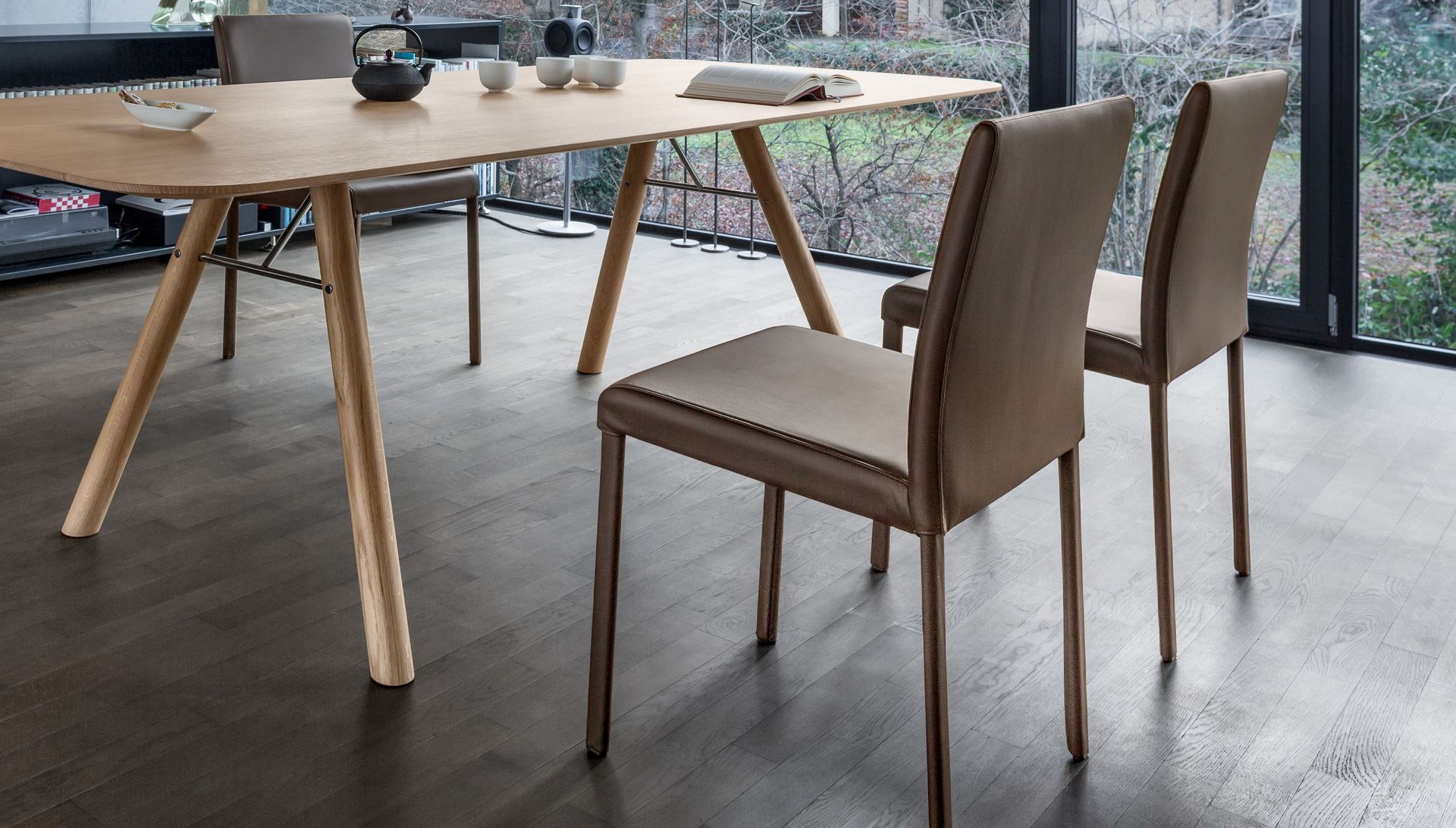 Le produit Chaise à quatre pieds - housse intégrale en cuir et bordée de surpiqûres- fine et élégante de GIRSBERGER existe dans les coloris : Brun .