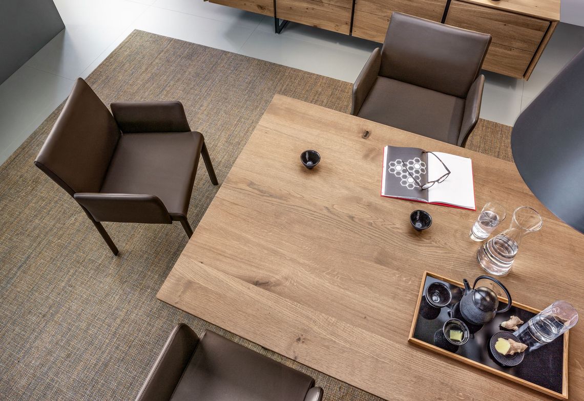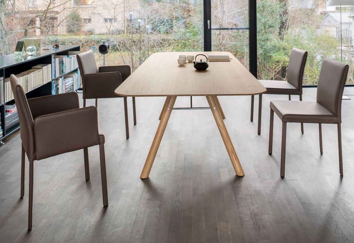 Kuba laisse la vedette au matériau. Un cadre en acier finement profilé constitue la structure de base, rembourrée et revêtue de cuir. Un grand confort d'assise et un travail du cuir soigneux caractérisent Kuba.